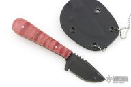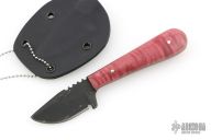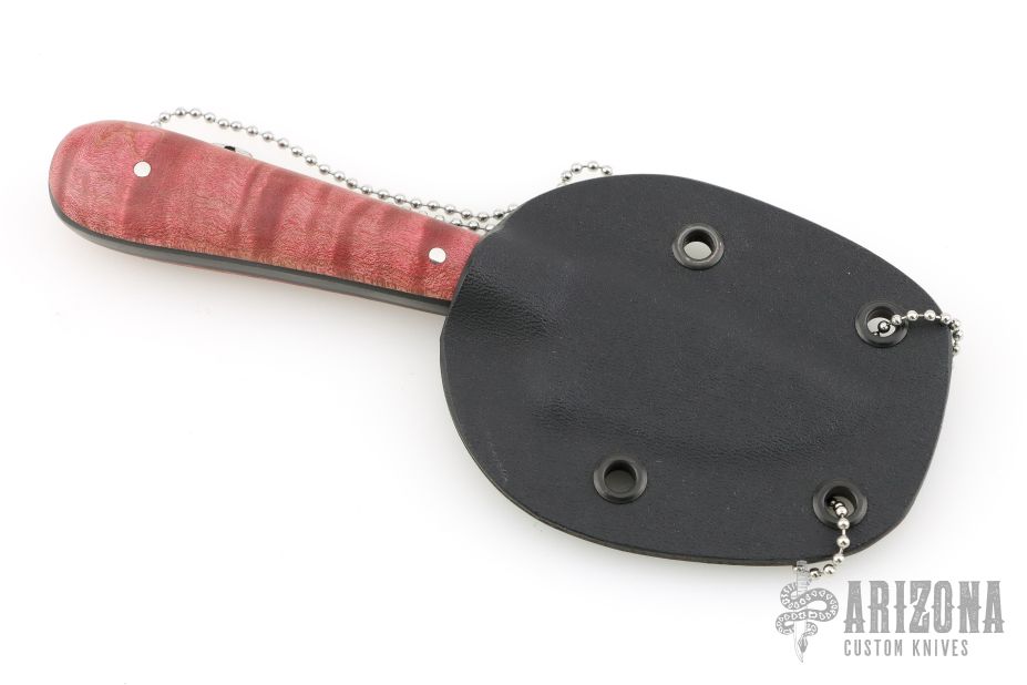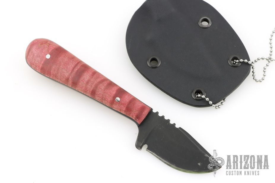 This EDC by Michael Key features a black blade with false top edge and notched thumbrest, .134" blade stock and 1.053" blade depth, full tang construction. The handle has dyed curly maple wood scales with black liners. Comes with a Kydex sheath with ball chain. Has some scuffs and scratches, otherwise good condition.