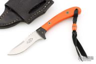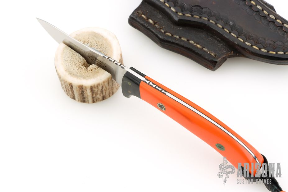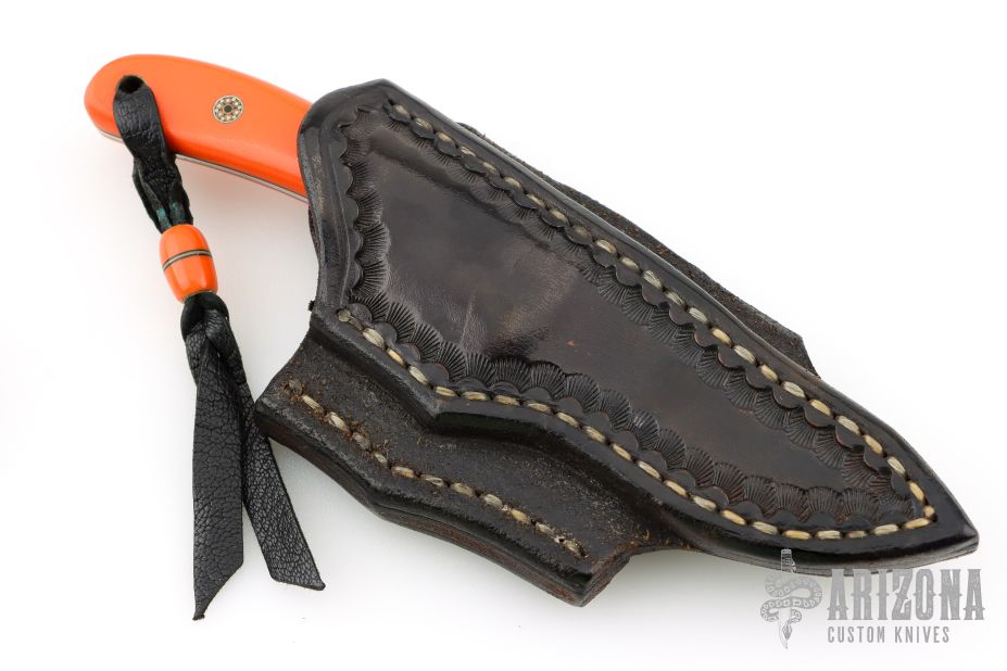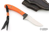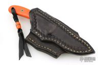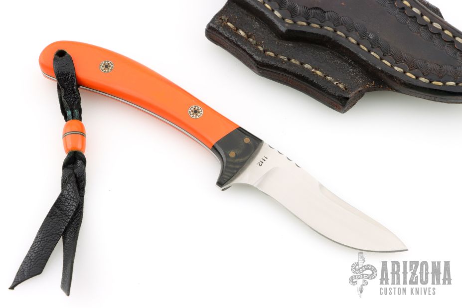 This Skinner by Alan C Warren features a hand rub satin finished blade with fileworked thumbrest and tang, full tapered tang construction, .094" blade stock and .778" blade depth. The handle has black linen micarta bolsters, orange G-10 scales with black liners and mosaic pins.  Includes a black leather tooled sheath. #1112 on the ricasso. Has a couple extremely light scratches, otherwise excellent condition.