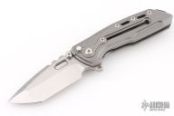 The Reate T1000 is a robust pocket knife that goes 110% on lock strength and 120% on general beefiness. Its hollow-ground tanto blade—made from super tough CPM 3V steel—flips open smoothly on a ball bearing pivot. There, the frame lock engages. For a normal knife, that would be enough; with the T1000, we're just getting started! You can engage two other optional locks: a button on either side of the pivot. Push these in, and there are now three points of contact keeping the blade secure; you can also engage the two button locks when the knife is closed. These buttons aren't traditional button locks: To disengage them, you'll need to push up on the slider on the spine of the knife's handle. Despite its size, the T1000 is ergonomic and smooth to operate. Its chunky, beautifully styled titanium handle will comfortably fill a larger hand, and its near-quarter-inch thick blade will take a beating and dish out an even bigger one. For cutting jobs small, large, or mammoth, the T1000 will perform like a champion. Without a doubt, this monster of a flipper knife is worthy of its namesake.