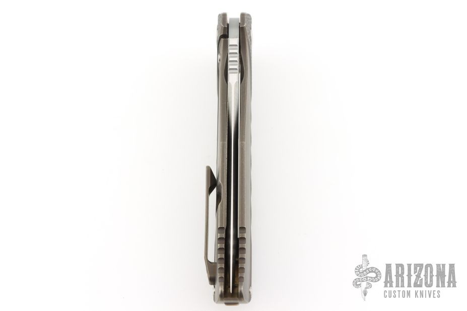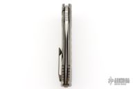 This K-2 from Reate Knives features a satin finished blade with false top edge, notched thumbrest and flipper. The handle has a milled and anodized titanium frame and tip up pocket clip, backspacer has been anodized blue. Nice detent, lockup and blade seating. Has a few light scuffs and scratches, otherwise excellent condition.
