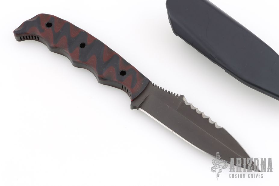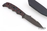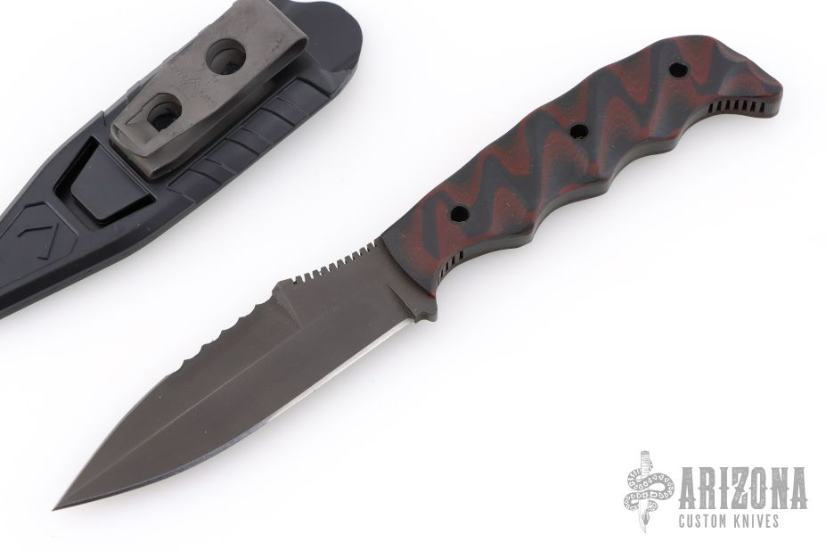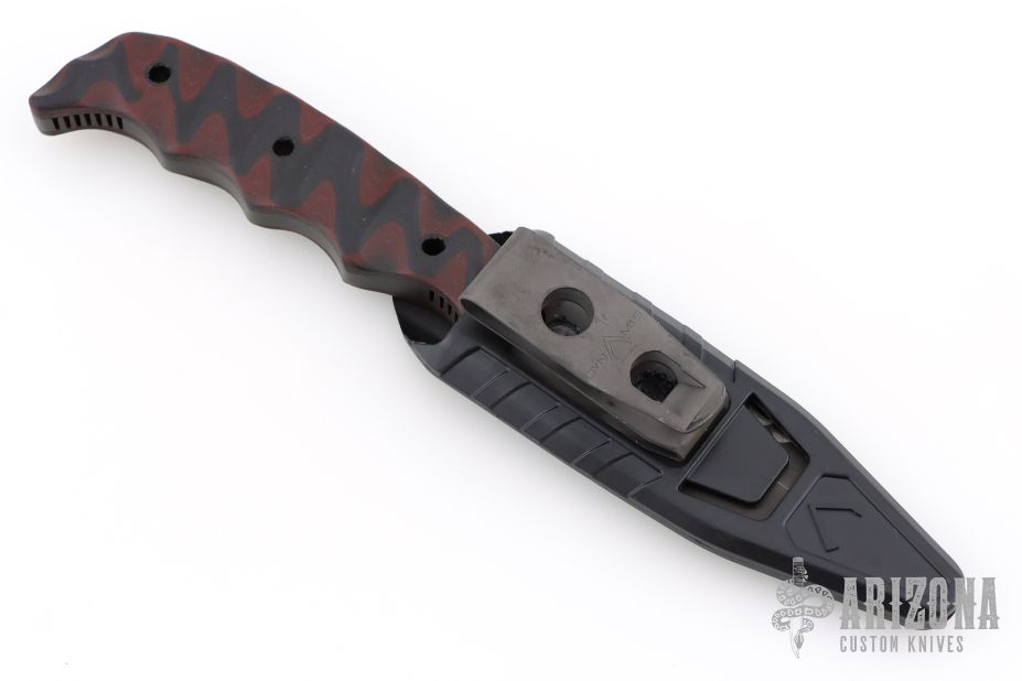 This Dynamis Revere fixed blade was crafted by Winkler Knives. It features a black spear point blade with sharpened and serrated top edge and notched thumbrest, .182" blade stock and 1" blade depth. The handle has sculpted black/red G-10 scales over full tang construction. Jimping on pommel provides purchase when holding in the reverse grip. Includes a molded plastic sheath with metal clip. Includes the original box and papers. Excellent condition.