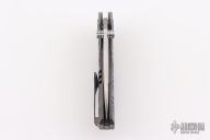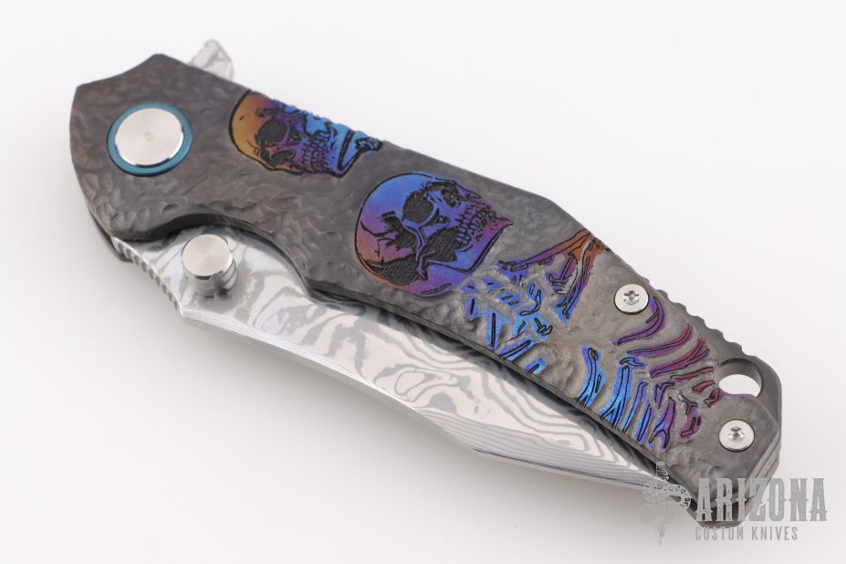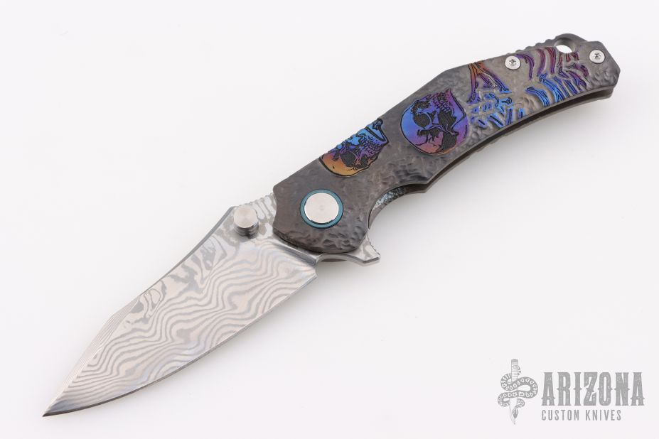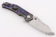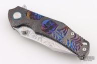 This Framelock Flipper by SixLeaf features a polished Damascus blade with dual thumbstuds, notched thumbrest and flipper tab. The handle has a bead blasted, carved, and anodized titanium frame with tip up clip, titanium backspacer with lanyard hole. Reversible clip. Comes in a plastic clasped case. Has some light scuffs and scratches, great overall condition.