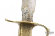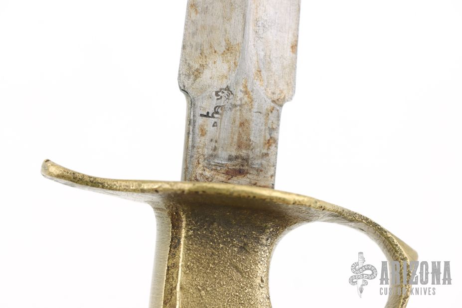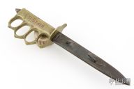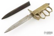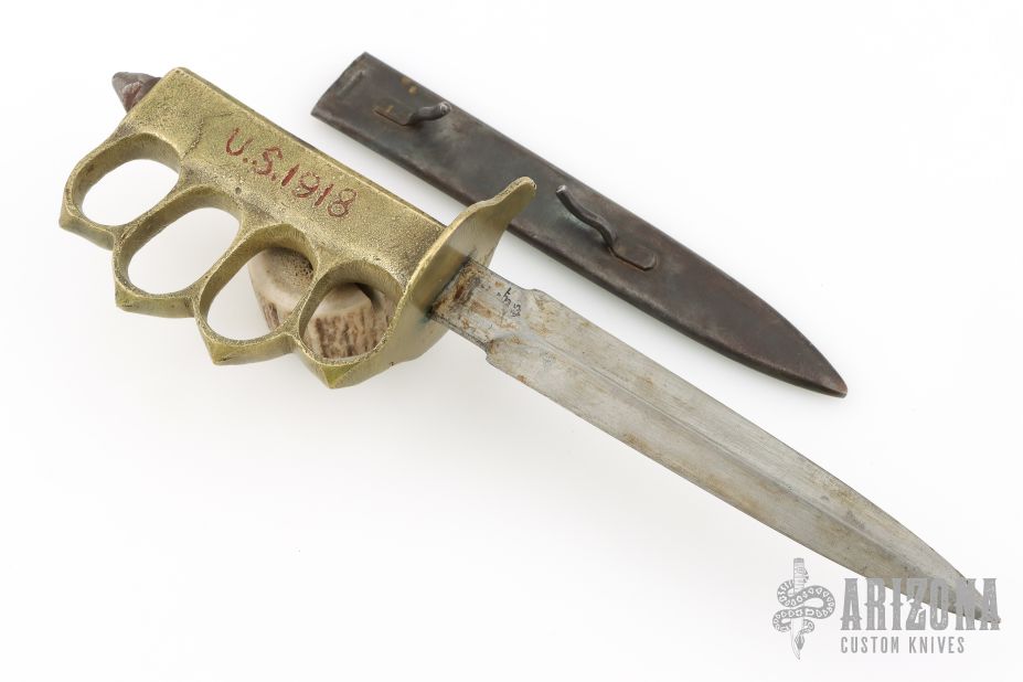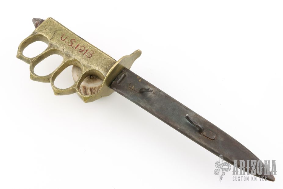 Extremely hard to find good examples. This is a WWI trench knife made by Au Lion, a French firm that helped to supplement the supply needed. Cast Brass handle with U.S. 1918 stamped. The blade is satin finished and double edged, .184" blade stock and 1.016" blade depth, hidden tang construction. Comes with original metal scabbard with tabs intact. Has some scratches and oxidation, a couple dings in the blade edge, the "US1918" has been colored in with red something, otherwise good condition for its age.