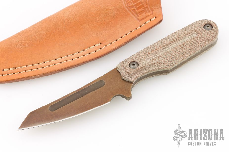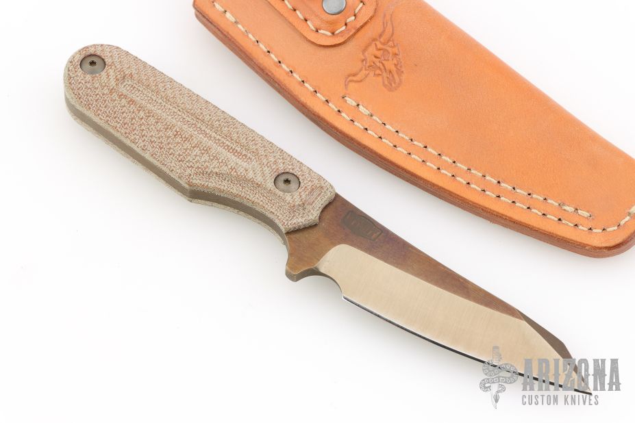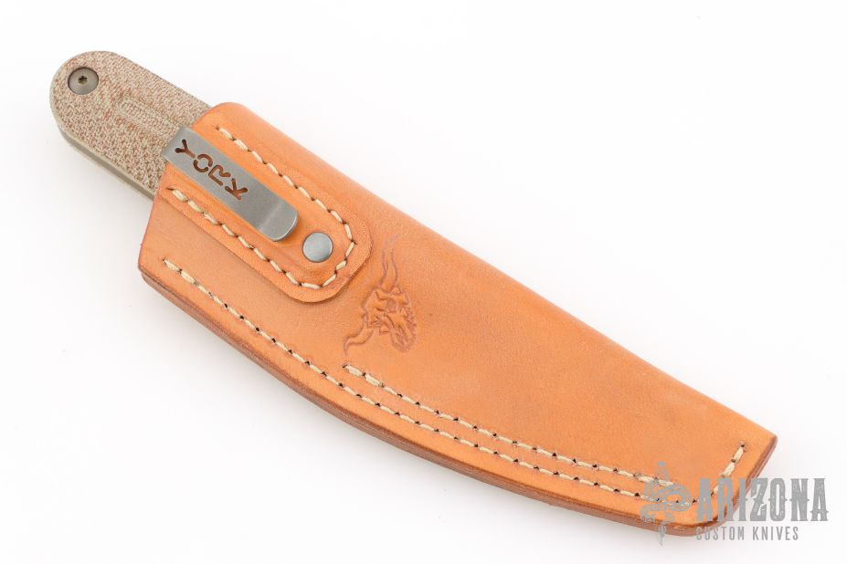 This Trilobite Persian Wharny by Jason Stout features a chisel ground blade with false top edge, fuller, .186" blade stock and 1.025" blade depth, full tang construction. The handle has canvas micarta scales with lanyard hole. Comes with card and York leather pocket sheath and COA dated 8/6/23. Excellent condition.