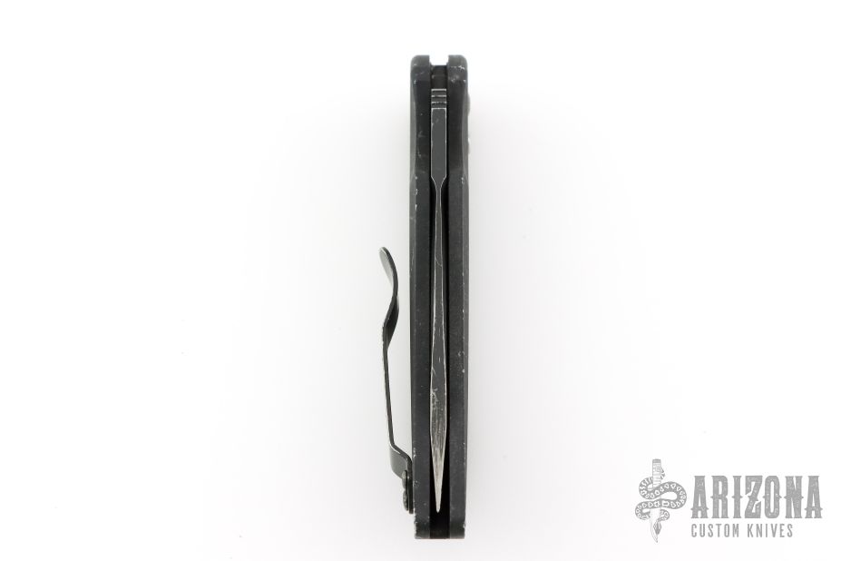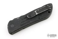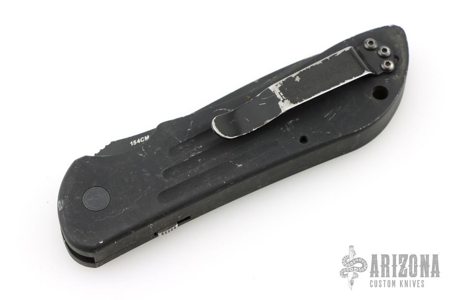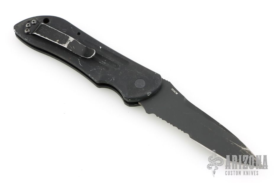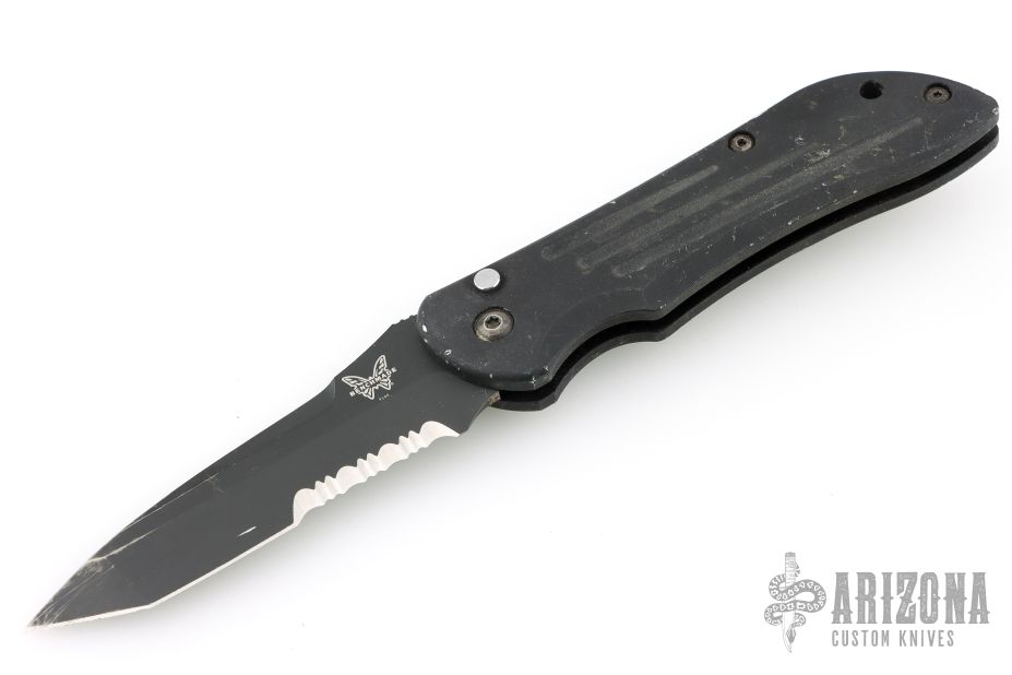 This 9100SBK by Benchmade features a black coated tanto blade with false top edge, partial serrations and a notched thumbrest. The handle is black aluminum with a black tip up stainless steel clip. Clip is bent out slightly. Has scuffs and scratches, fair condition; good user condition otherwise.