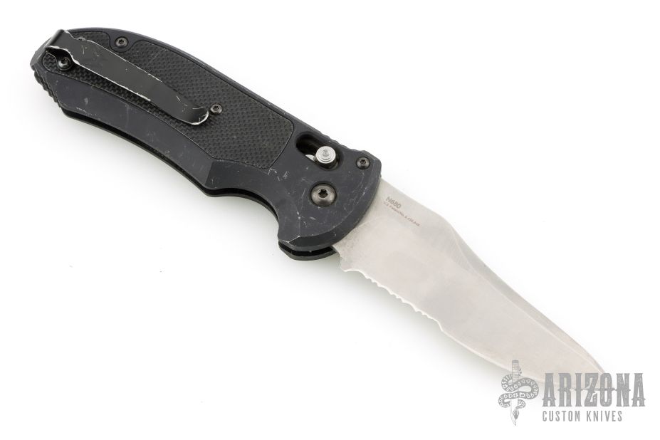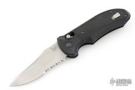 The Benchmade Triage series has you covered with a tool that truly epitomizes what it takes to be prepared for any type of emergency situation. This Benchmade Black Class automatic was designed very purposely--from the design of the blade, to the specific blade material used all the the way down to the functional components and additives. The blade material chosen for this series was Bohler N680--an Austrian steel designed for extremely harsh environments like salt water plus offering the best corrosion resistance while still offering plenty of edge retention and strength. This blade is powered by the Benchmade auto AXIS system which provides quick action and a rock sold lockup and is opened by simultaneously pulling back on the dual tab design. Additional features include an automatic deploying 440C stainless steel seat belt/strap cutter hook that is conveniently housed in the handle scale, an integrated slide safety on the spine as well as a carbide glass breaker to further increase this knife's utilitarian value. This model, the 9170S, features a satin finished partly serrated drop point blade, a black anodized aluminum handle, with a black G-10 inlay, and the pocket clip is designed for tip up carry only but is eligible for left or right hand carry options. Made in the USA. Discontinued.
