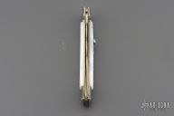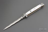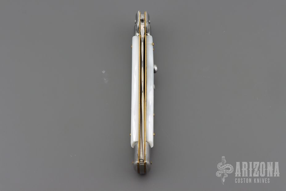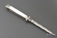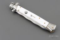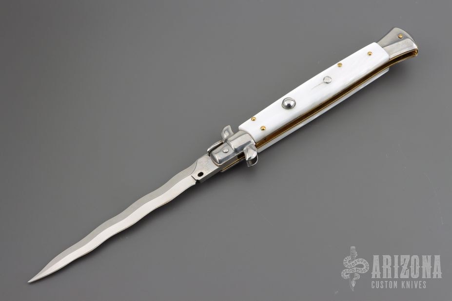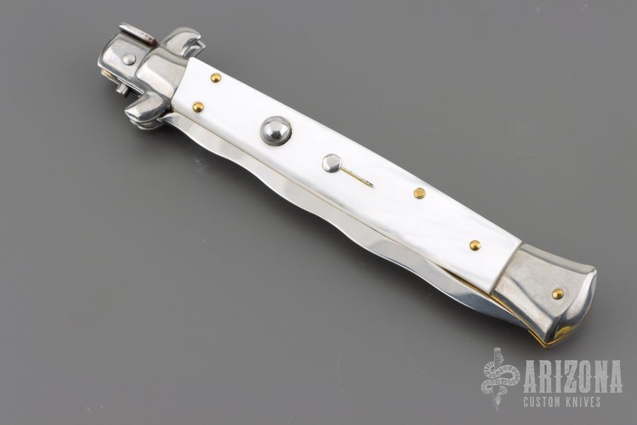 This Swivel Bolster Auto has a Kris ground blade with false top edge. The handle is composed of a steel front and rear bolsters, brass liners all complemented by pearlex scales. Excellent condition.