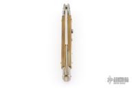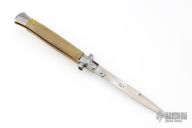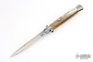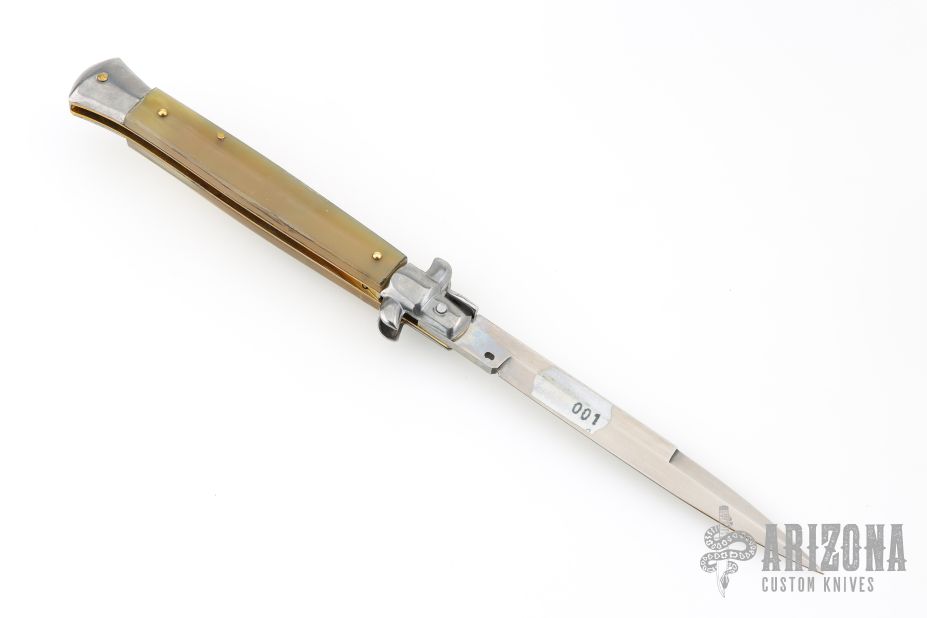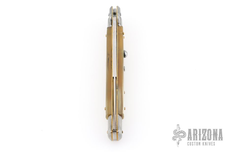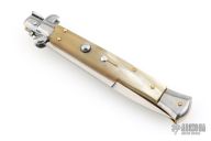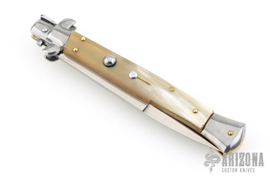 This 11" Swivel Bolster Auto by Frank Beltrame features a polished dagger ground blade with false top edge. The handle has stainless steel bolsters, front and rear, blonde horn scales, brass liners, stainless spring. Excellent condition.