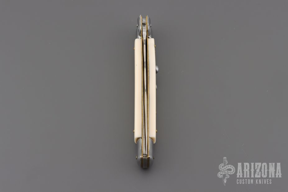 This Swivel Bolster by Frank Beltrame features a polished Kris ground blade with false top edge. The handle has stainless steel bolsters, front and rear, imitation ivory scales, brass liners, stainless spring. Excellent condition.
