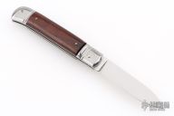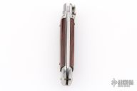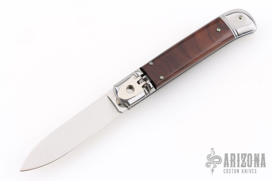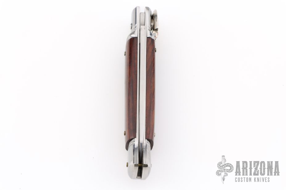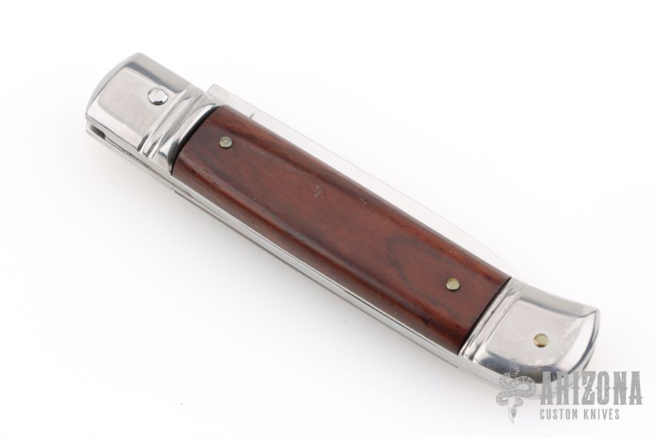 This leverlock auto by G&O Massaro features a polished blade with a stainless spring. The handle has stainless bolsters and butt, wood scales and stainless liners. Excellent condition.
