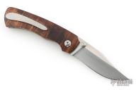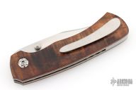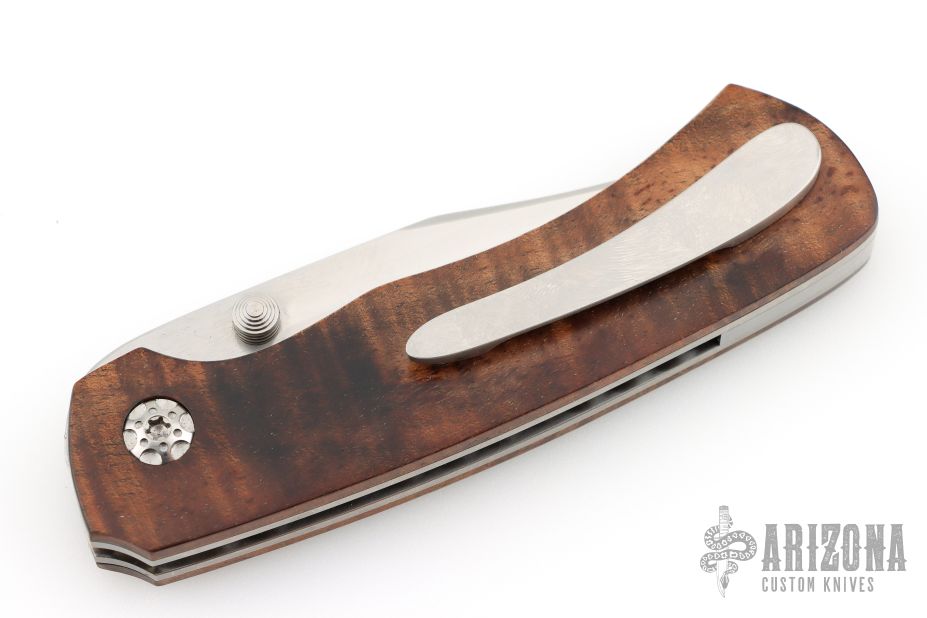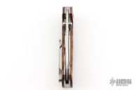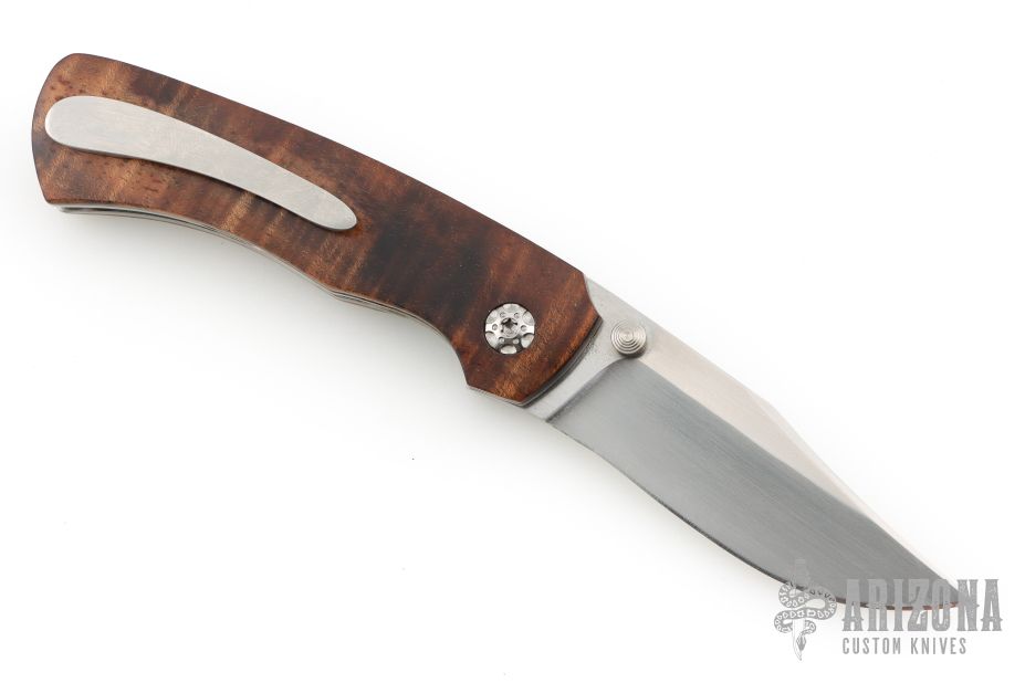 This Fine Folder by Carl Colson features a hand rub satin finished blade with dual thumbstuds. The handle has Tasmainian Blackwood scales, titanium liners with jeweled interiors, stainless steel backspacer, tip up titanium clip with hidden screws. Nice detent and lockup. Has some scratches on the tip of the blade and clip, otherwise excellent condition. Comes with a zippered case and COA dated 4/10/25.