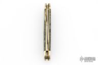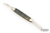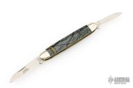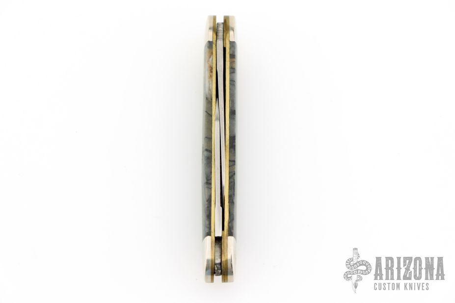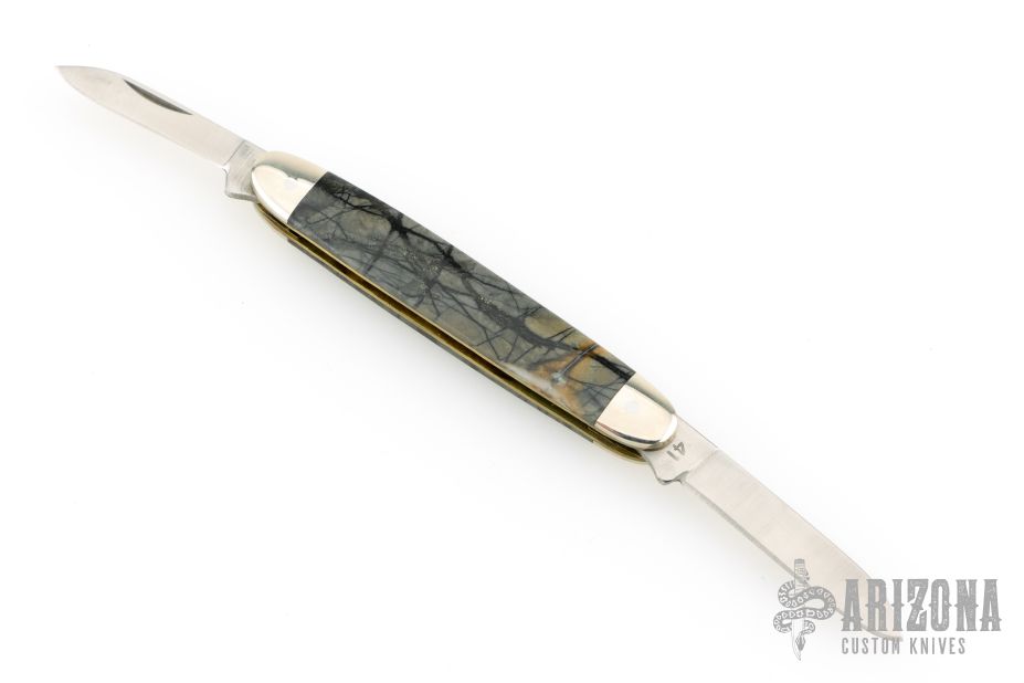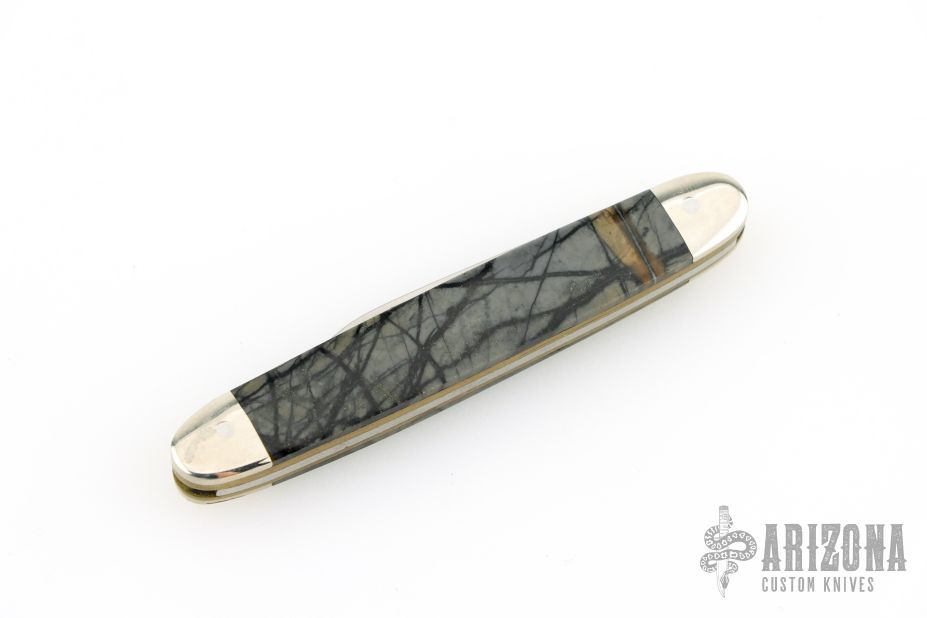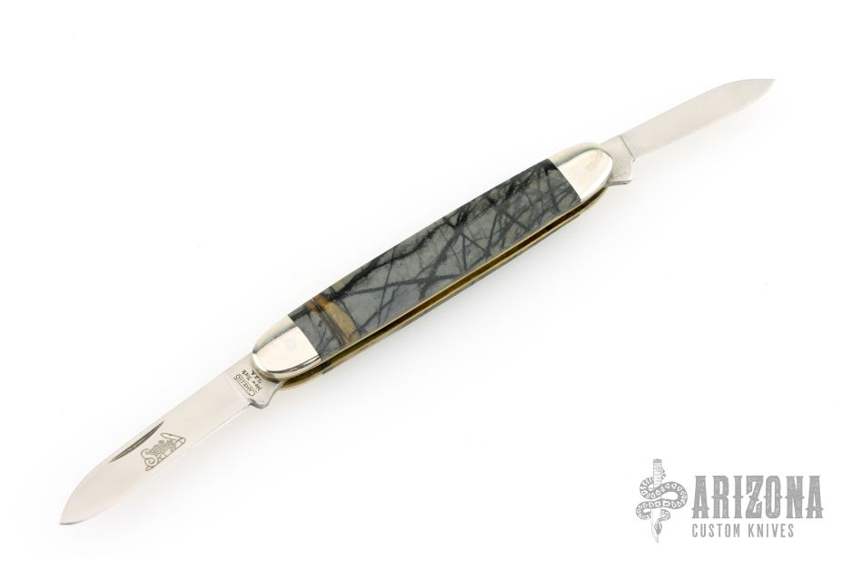This slipjoint by Camillus was customized by Santa Fe Stoneworks. It features satin finished blades with nail nicks. The handle has nickel silver bolsters, stone inlays, brass liners, stainless steel backspacer. Has a few light scratches, otherwise excellent condition.