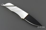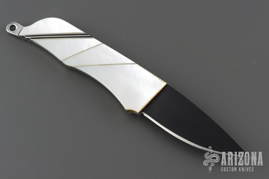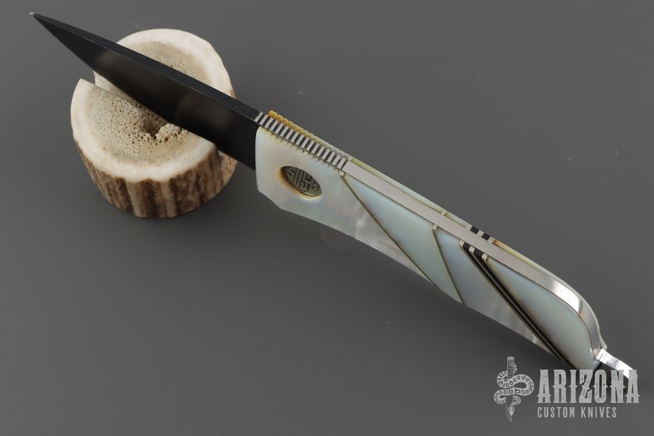 This vintage SOS from Benchmark Knives features a black drop point serrated blade with notched thumbrest, 1/8" blade stock and 1" blade depth. the handle has mosaic pearl silver and black spacers/inlays. Customized by Santa Fe Stoneworks. Has some light scufsf and scratches, excellent condition.