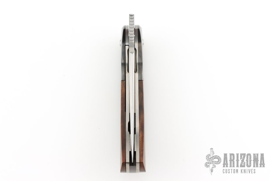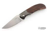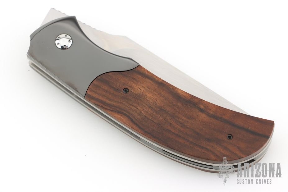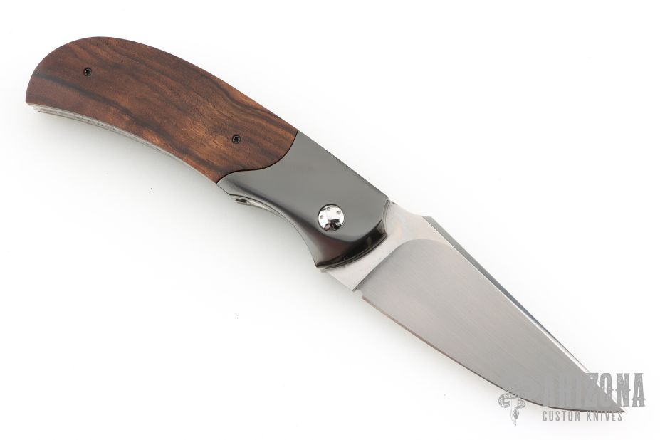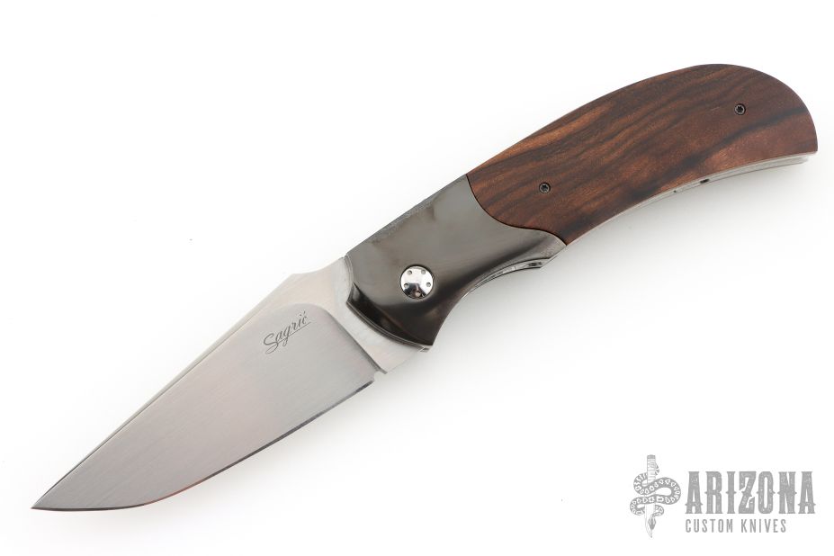 This Front Flipper by Stephane Sagric features a hand rub satin finished blade with swedge and notched thumbrest, front flipper style opening. The handle has polished zirconium bolsters, cocobolo scales, with titanium liners, zirconium backbar with lanyard bail. Rides on bearings, nice detent, lockup and blade seating. Comes with a leather case. Excellent condition.