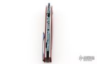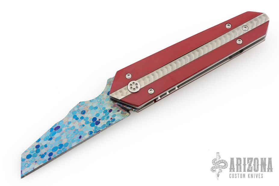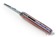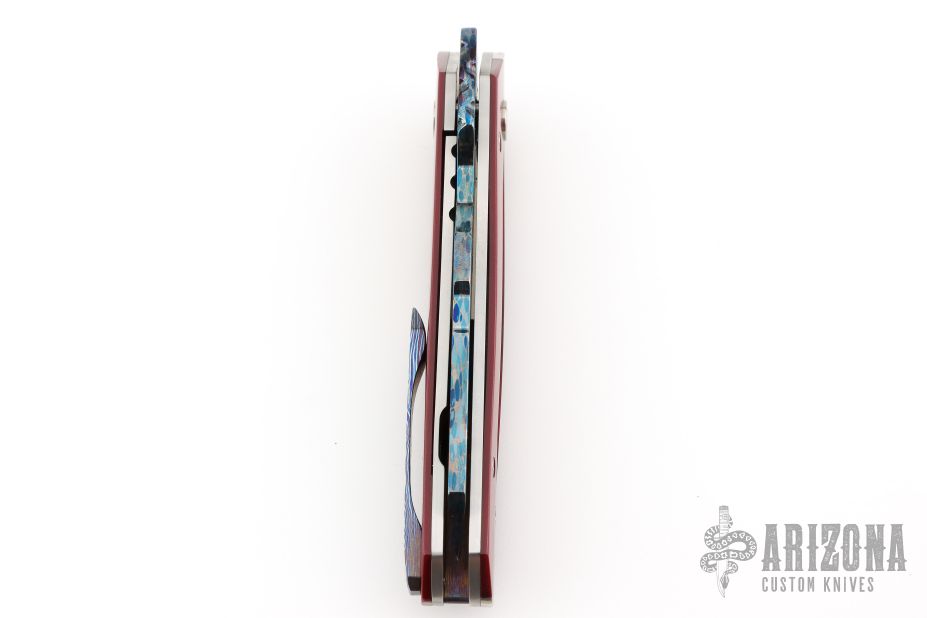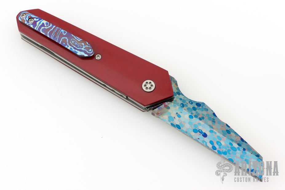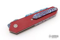 This one off linerlock front flipper by KC Gray features a Dragon Skin Damascus blade with fileworked thumbstud. The handle has red paper micarta scales with a jeweled titanium inlay, titanium liners, fileworked timascus backspacer and tip up clip. Nice detent, lockup and blade seating. Rides on bearings. Comes with a zippered case and COA dated 2-25. Excellent condition.