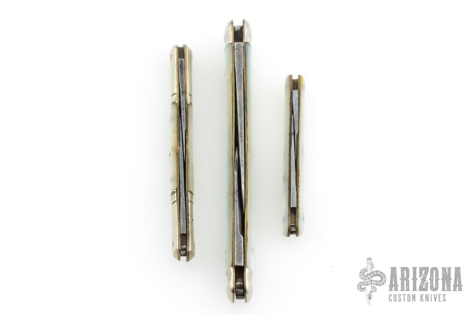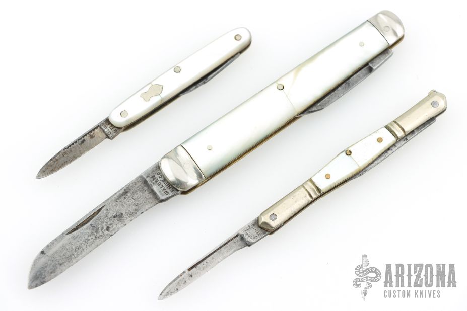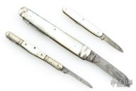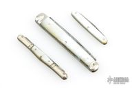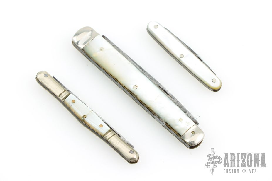 Lot of three vintage slipjoints. Pearl covers, silver bolsters/escutcheons, and steel springs. They all have scuffs, scratches, light rust, and patina. Good condition for their age.