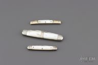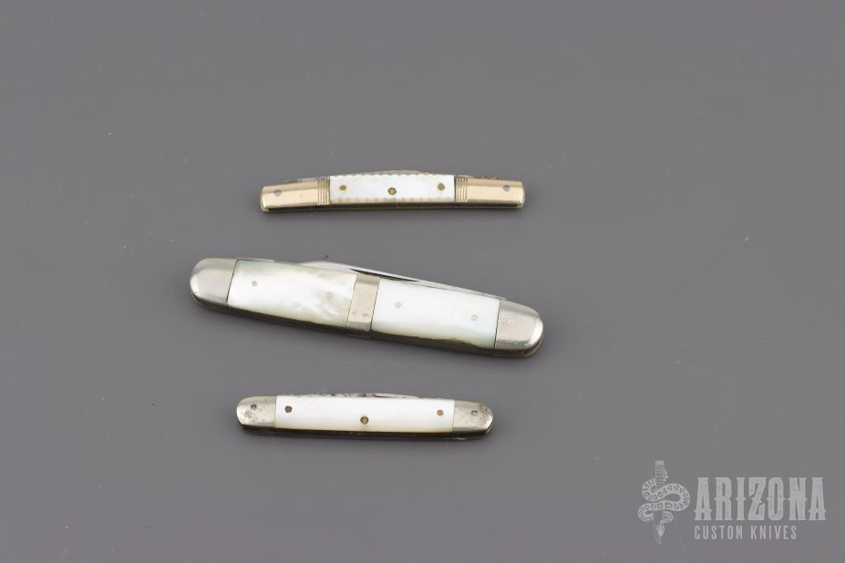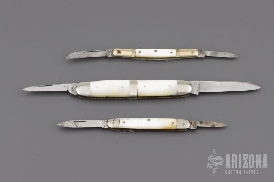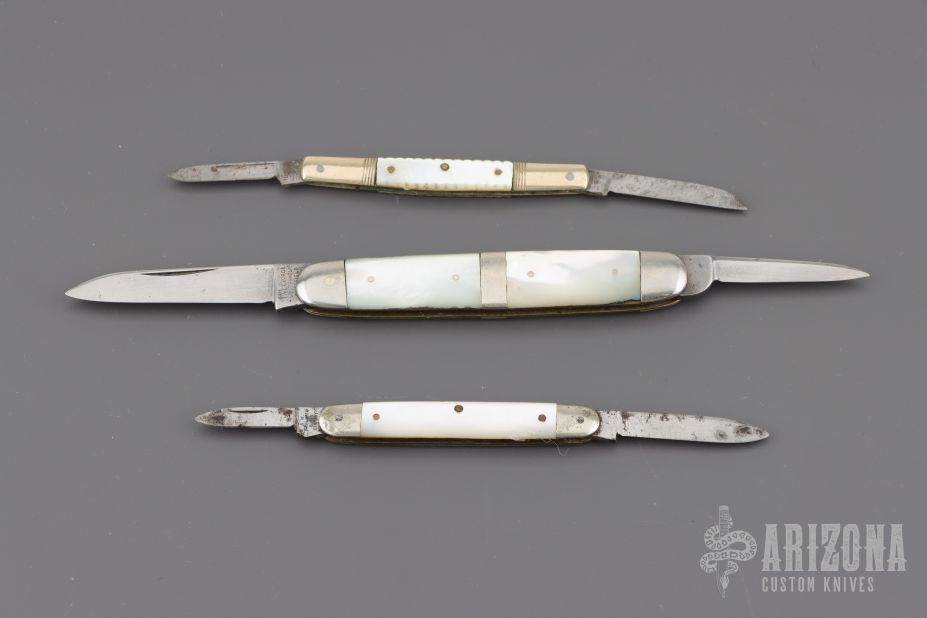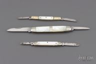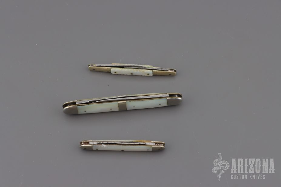 Lot of three vintage slipjoints. Pearl covers, silver bolsters/escutcheons, and steel springs. They all have scuffs, scratches, light rust, and patina. Good condition for their age.