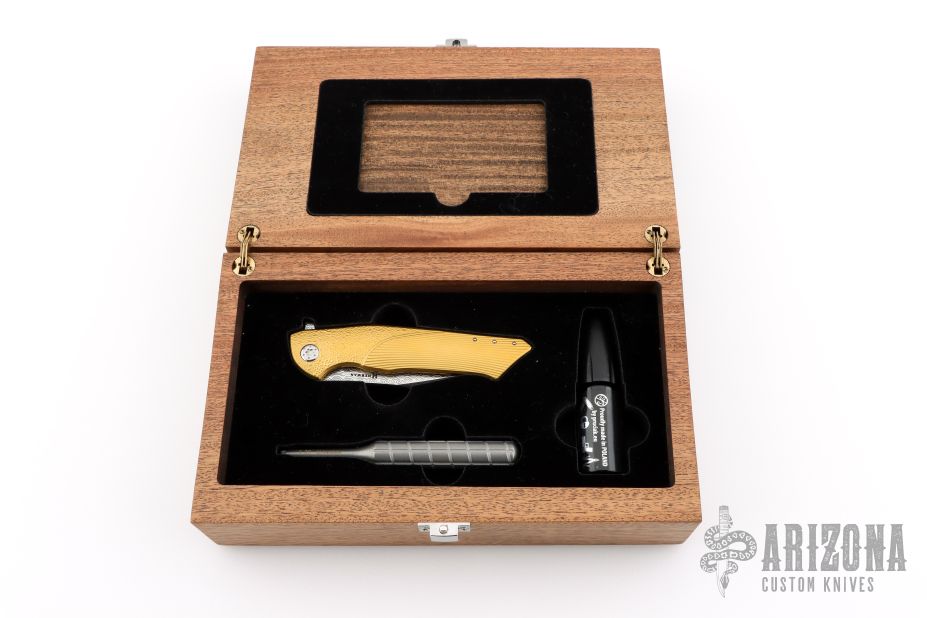This Folder Bee Flipper by Herman Knives features a Damasteel blade with a flipper. The handle has a milled and anodized titanium frame with titanium liner, timascus tip up clip and backspacer. Nice detent, lockup and blade seating. Rides on bearings.  Comes with original wooden box, tool, lube and COA dated 2/4/25 #0185. Excellent condition.