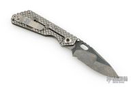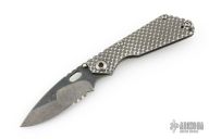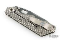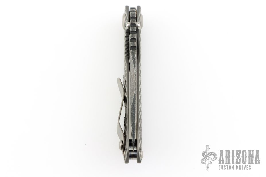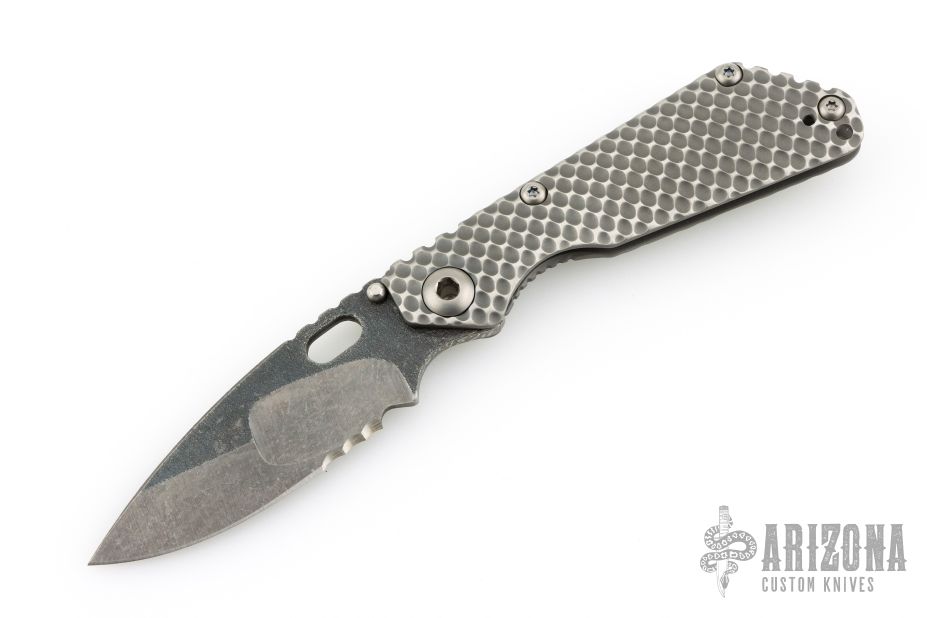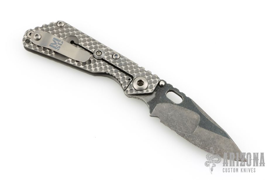 This SNG framelock folder by Mick Strider features a stonewashed Nightmare Ground blade with serrations, a dimple pattern titanium frame, and tip up titanium clip. Includes a "Lock Bar Stabilizer" for maximum reverse lock retention. Nice detent, lockup and blade seating. Comes in SOE zipper case. Signed in the finger choil. Excellent condition.