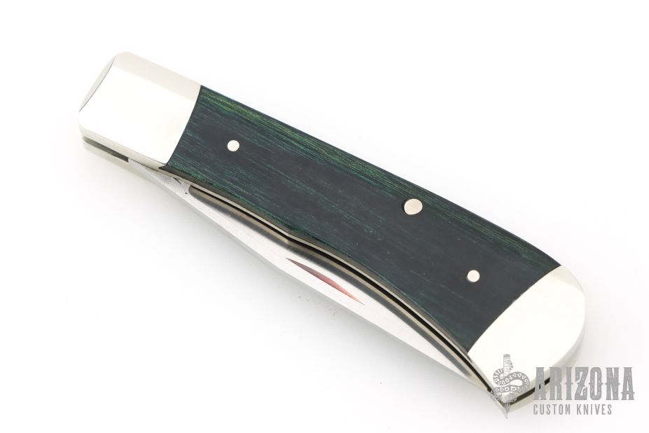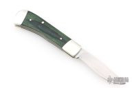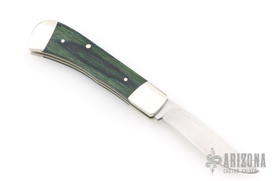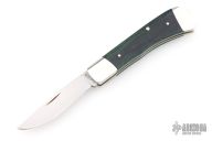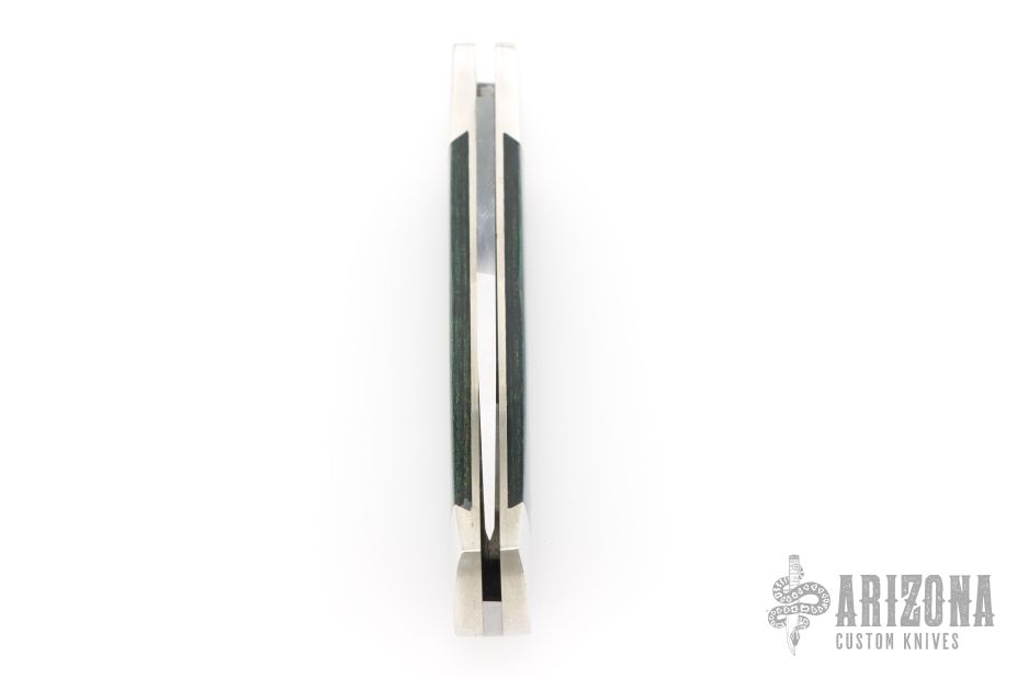 This Single Blade Trapper by Don Morrow features a satin finished recurve blade with nail nick. Blade has half stop, flush in the open and closed positions. The handle has nickel silver dovetailed bolsters, laminated wood covers, nickel silver liners with fileworked spine, stainless steel spring. Has some light scratches, otherwise excellent condition.
