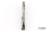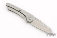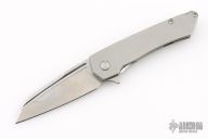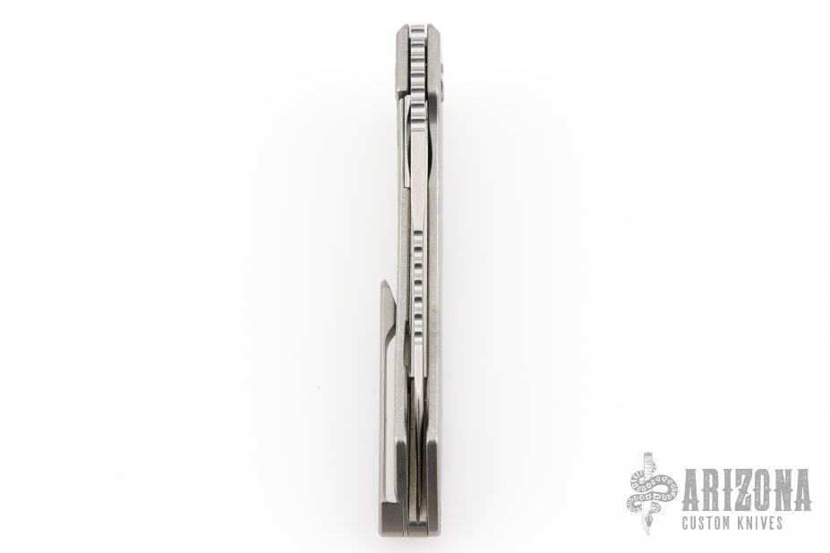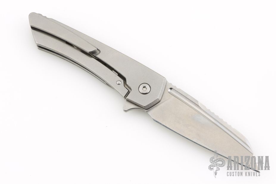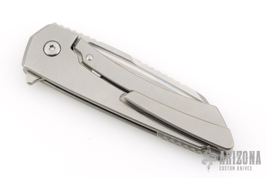 This Mojave by Machine Wise features a stonewashed blade with flipper tab, notched thumbrest, and fuller. The handle is bead blasted titanium with a milled pattern. Titanium tip up clip. Includes original 3D printed box, tool, lube and card. S/N 739. Has some light scuffs, excellent overall condition.