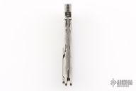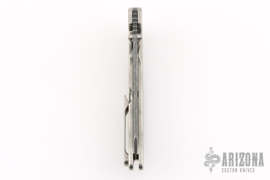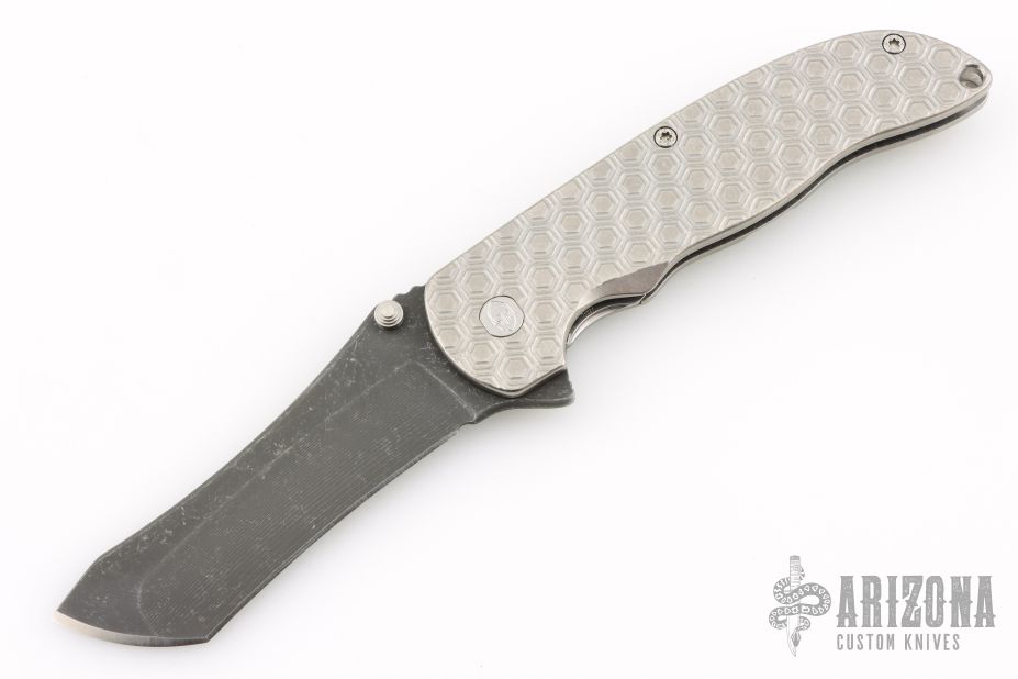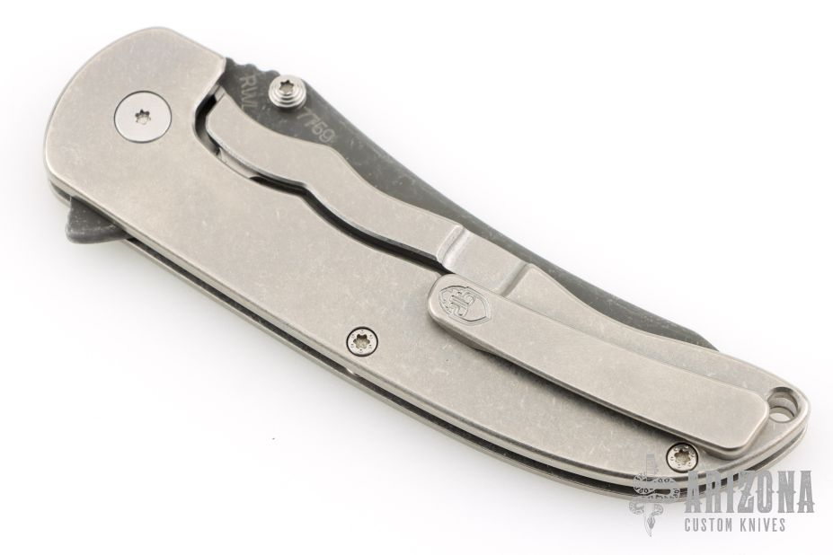 This Norseman (#7759) by John Grimsmo features an acid tumbled blade with a single titanium thumb stud, notched thumb ramp and flipper. Stonewashed titanium frame with a double honeycomb pattern front scale and titanium screws. Matching tip up pocket clip. Very smooth action that requires no wrist movement. Nice detent, lockup and blade seating. Rides on ceramic bearings. Comes with original hard case and COA dated Aug 27, 2024. Excellent condition.