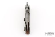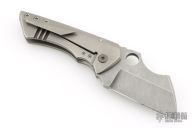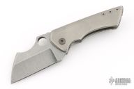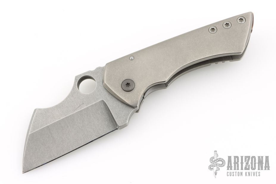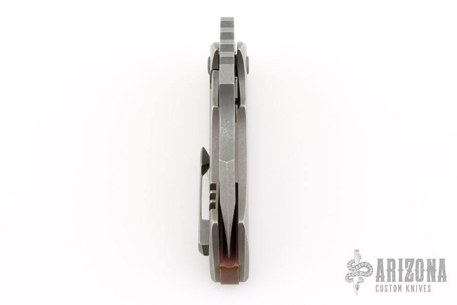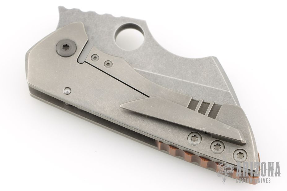 This Rhino by Sergey Rogovets features a stonewash finished blade with notched thumbrest and a thumbhole. The handle has a stonewashed titanium frame and notched copper backspacer, tip up stonewashed titanium clip. Comes in a hard case with COA and maker's drawstring pouch. Has a few light scuffs and scratches, otherwise Excellent condition.