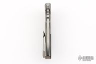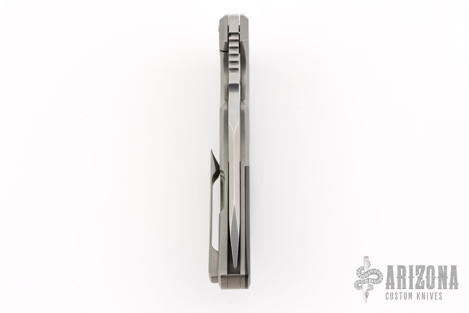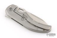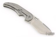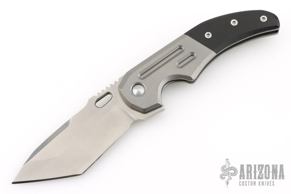 This Chopp Hound by Chopp Knives featured a polished stone wash finished tanto blade with swedge, thumb hole and thumb ramp. The handle has milled titanium bolsters, black G10 overlays, tip up titanium clip and titanium lock side. Comes with COA, extra hardware, and zipper case. Excellent condition.