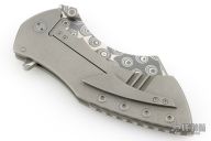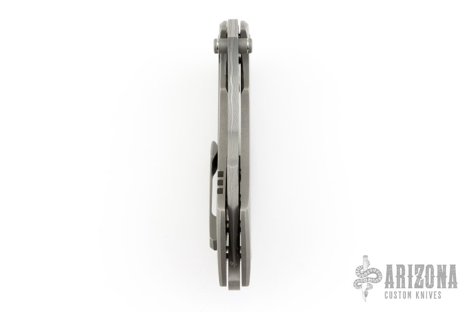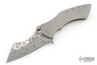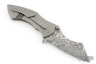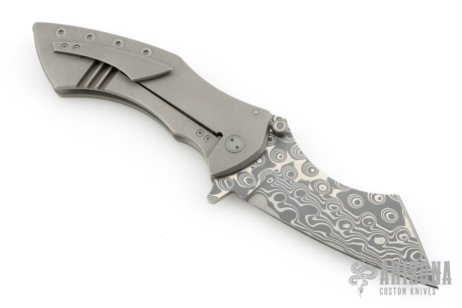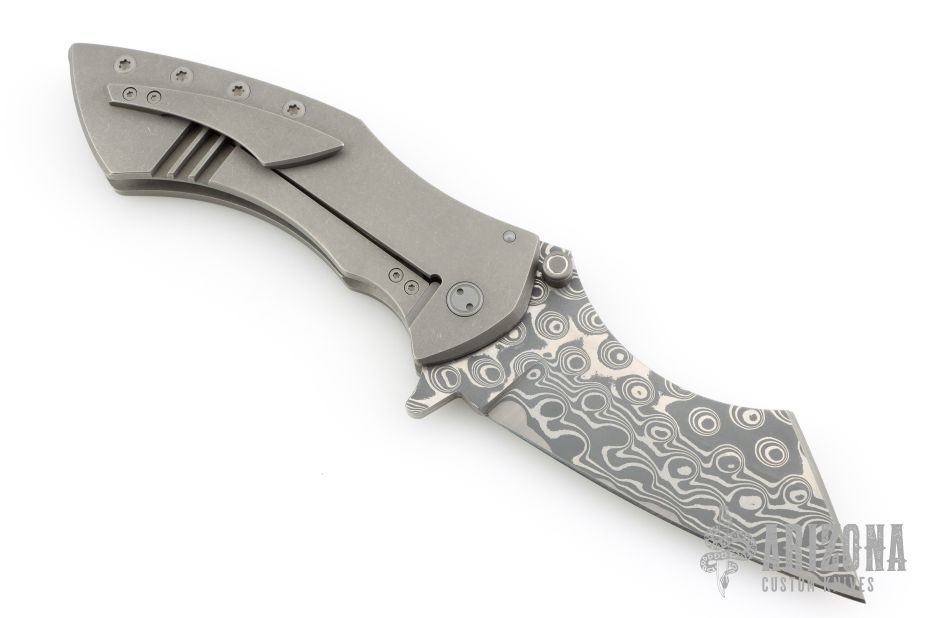 This Model XR3 framelock flipper from Sergey Rogovets features a Chad Nichols Damascus blade with flipper. The handle has a textured titanium frame with a matching pocket clip, tip up carry, floating notched backstrap. Blade is centered when closed and opens smoothly. Locks up with no play, has a stainless lockface insert. Knife is in excellent condition with only a couple light scratches. #2429, comes with original box and COA dated June 2024.