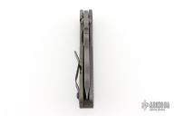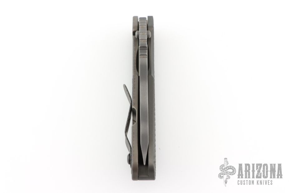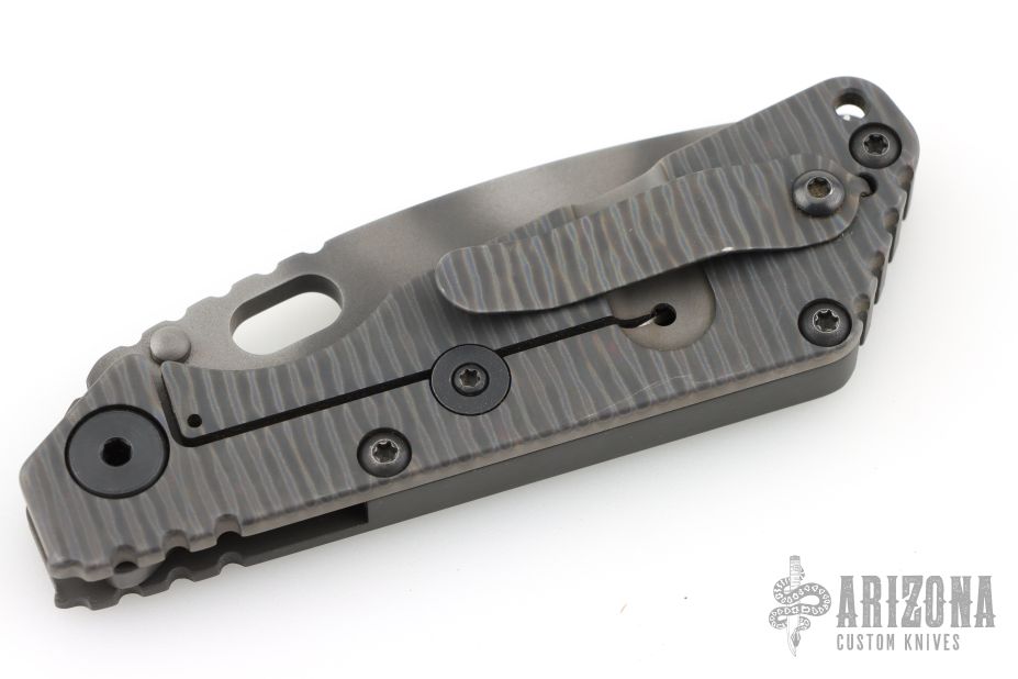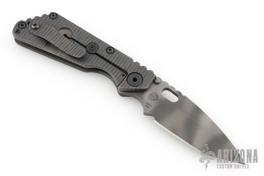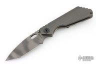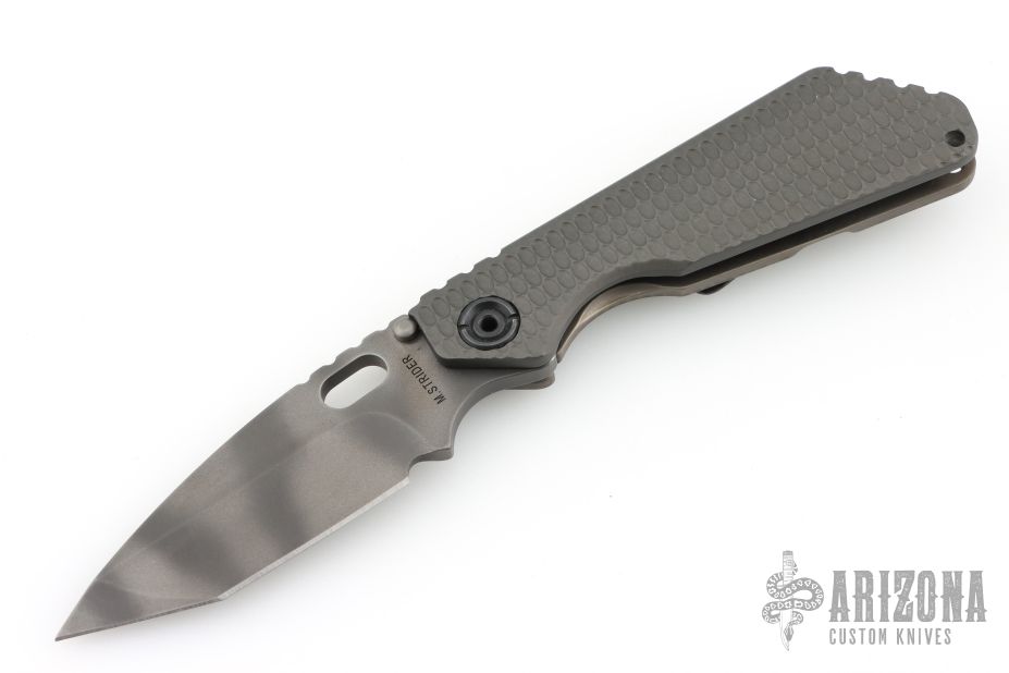 This SNG framelock folder by Mick Strider features a tiger stripe spear point blade and a dimple pattern grey aluminum and flamed titanium frame and tip up titanium clip. Includes a "Lock Bar Stabilizer" for maximum reverse lock retention. Nice detent, lockup and blade seating. Has a couple scuffs/scratches, otherwise excellent condition.