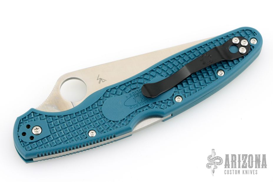 The Police 4 is the largest member of Spyderco's select family of lightweight knives featuring K390 MICROCLEAN tool steel blades. Ideal for extreme cutting challenges, it combines the toughness and superior edge-holding characteristics of K390 with all the proven qualities of this highly refined design -- including the low-friction edge geometry of a full-flatground, PlainEdge blade, a fully accessible Trademark Round Hole, a high-strength back lock mechanism, and a four-position pocket clip.