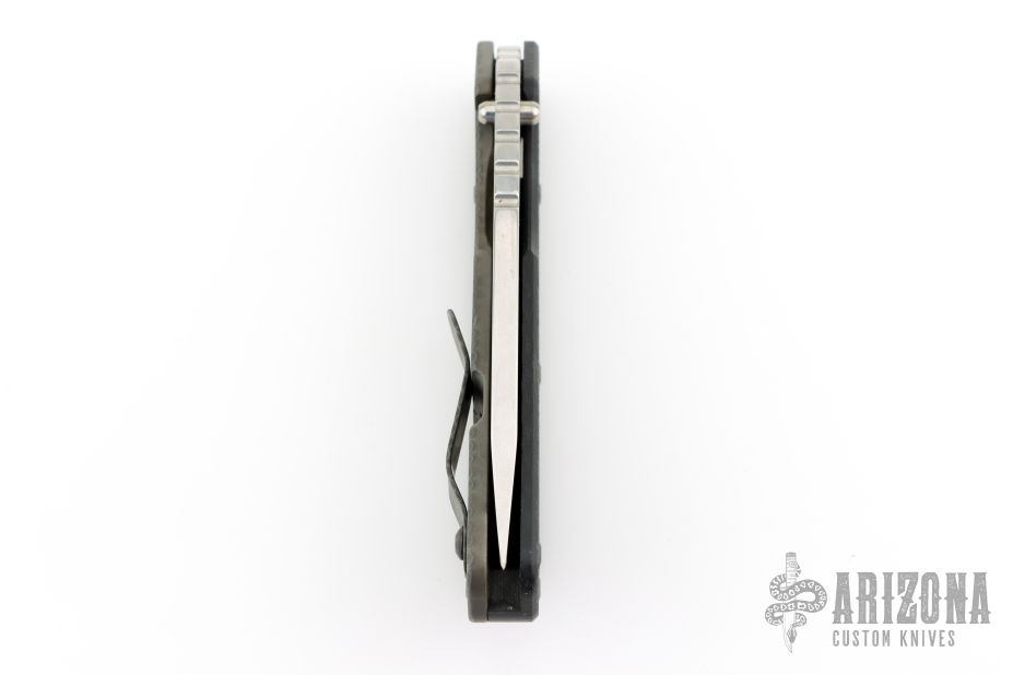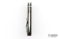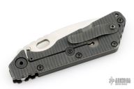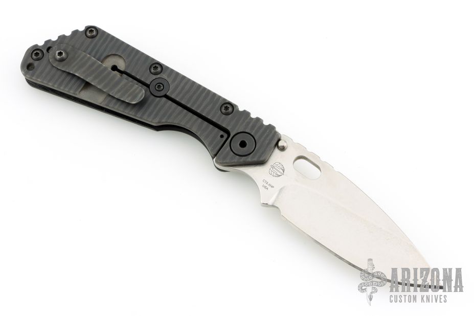 This SMF framelock folder by Mick Strider features a stonewashed drop point blade with a notched thumbrest.  The handle features a textured G-10 scale and a flamed titanium lockside with a tip up clip. Has some scuffs and scratches, great overall condition.