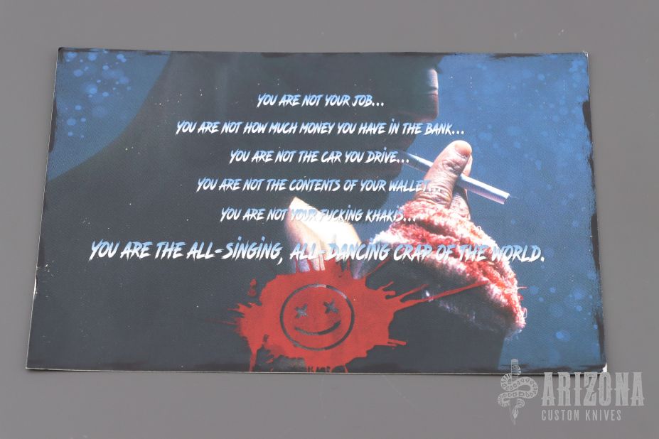 Very limited run of 100 pieces, this patch by Workshop 432 features the mysterious Ringleader of that Club you are not supposed to talk about.  Fully Embroidered with Velcro Backing. 5.75" x 4" (approx) Includes card with movie quote. Excellent condition.