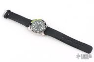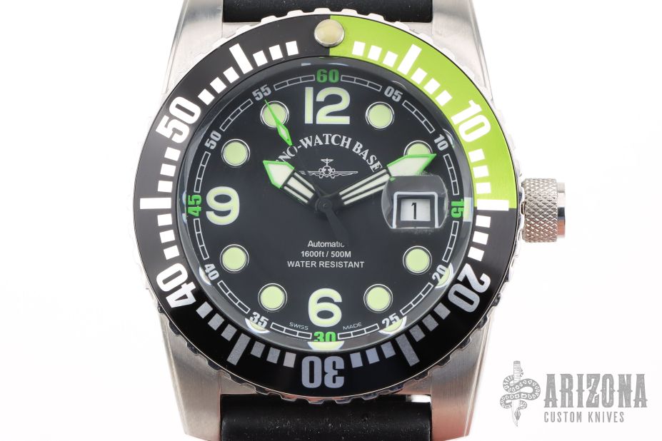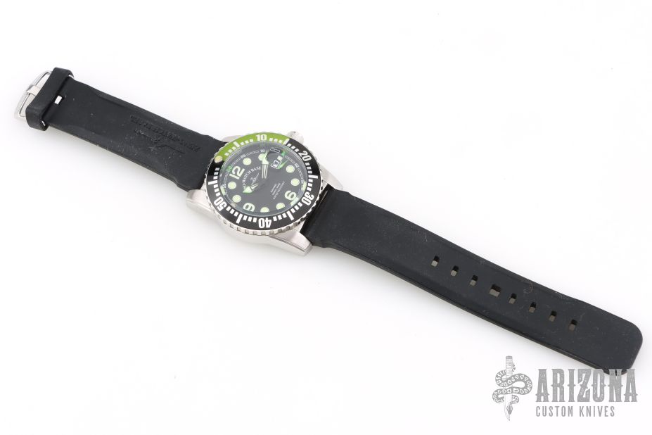 Stainless steel diver watch with dual time indication and magnifying glass. black+green bezel ring