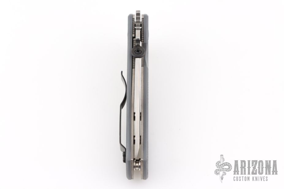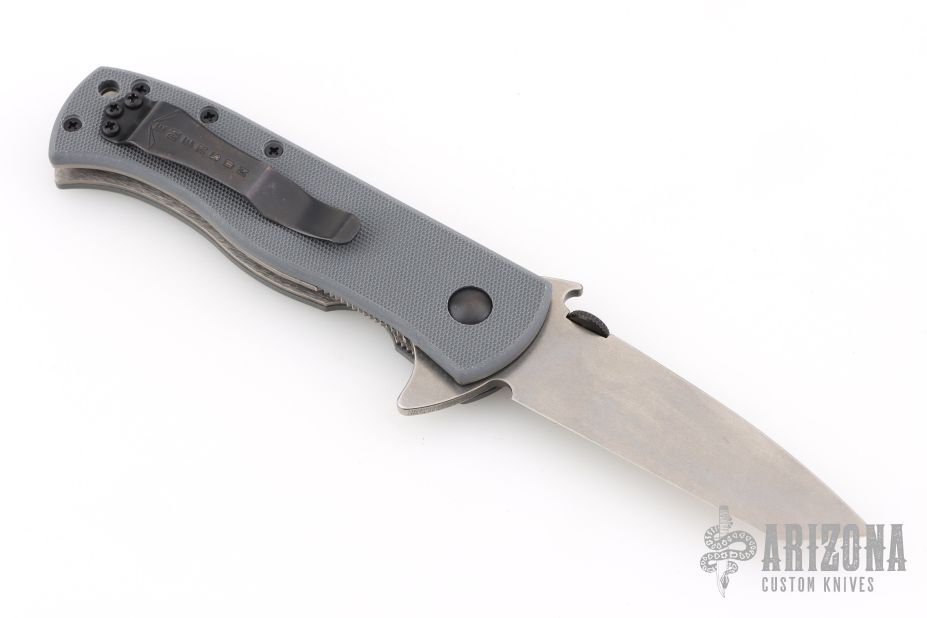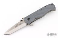 This CQC-7 from Emerson Knives features a two-tone chisel ground tanto style blade with stonewashed flats and satin grinds. The blade has a swedge, knurled thumb disc, wave features and flipper. The handle has grey G-10 scales over titanium liners and satin spacers. Black tip up steel clip and lanyard hole in pommel. Great blade seating, detent and lock up. Comes with original box and papers. Excellent condition.