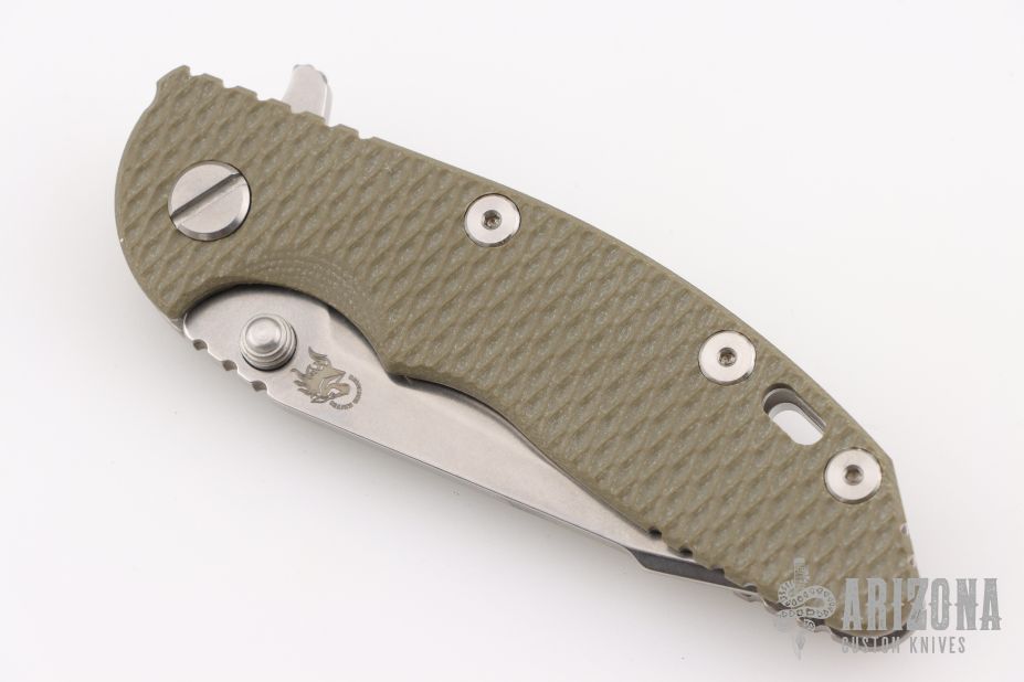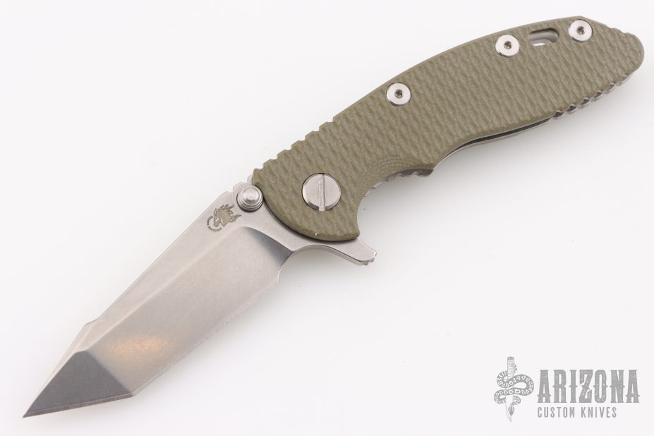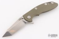 This 3" Harpoon Tanto from Hinderer Knives features a 3" working stonewash harpoon tanto shaped blade, textured green G-10 scale and stonewash finished titanium handle, clip, and hardware. Clip can be mounted for tip up or down carry. Nice lockup, seating, and detent. Comes with original box, card and extra washers. Excellent Condition.