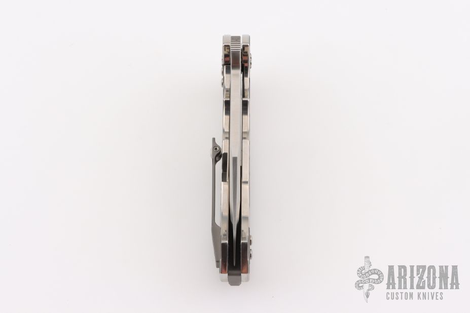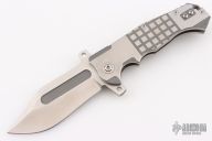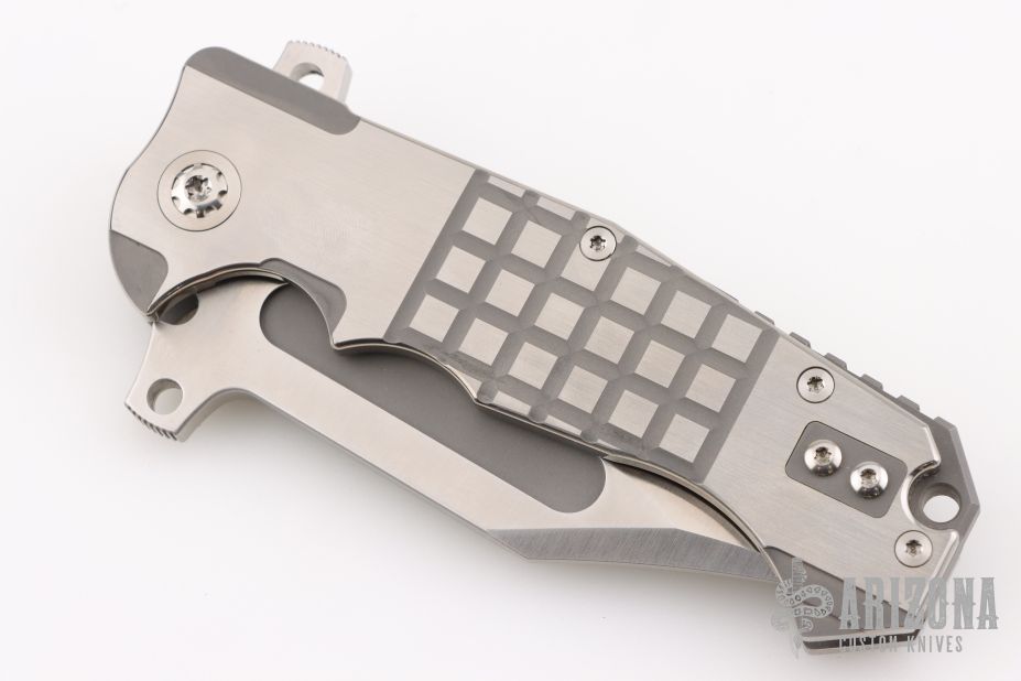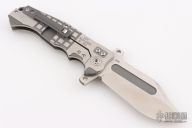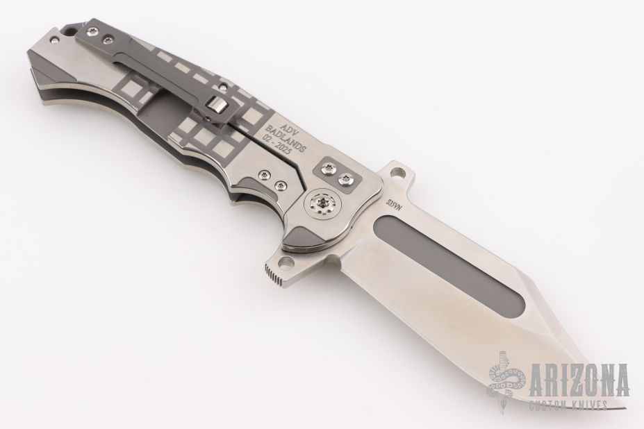 This ADV Badlands framelock flipper has a satin finished blade with swedge, fullers, notched thumbrest and flipper. Handle has a two-tone titanium frame, titanium backspacer and tip up clip with roller, satin hardware. Rides on bearings, nice smooth action, detent, lockup and blade seating. Comes with nylon zippered case. Excellent condition.