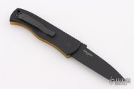 This Emerson/Pro-Tech CQC7 automatic has a chisel ground black blade with a plain edge and an Ultem and black aluminum handle with a satin push button.  Black stainless steel clip. Coil spring. Comes with original box, pouch, and papers. Has a couple light scuffs and scratches, excellent condition otherwise.