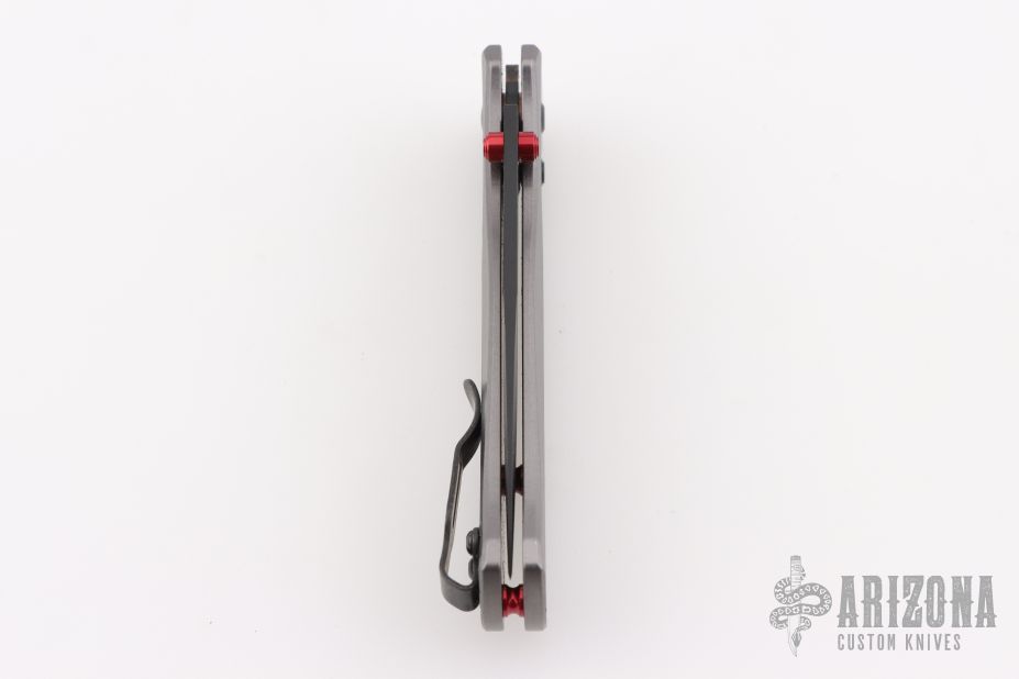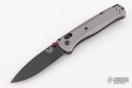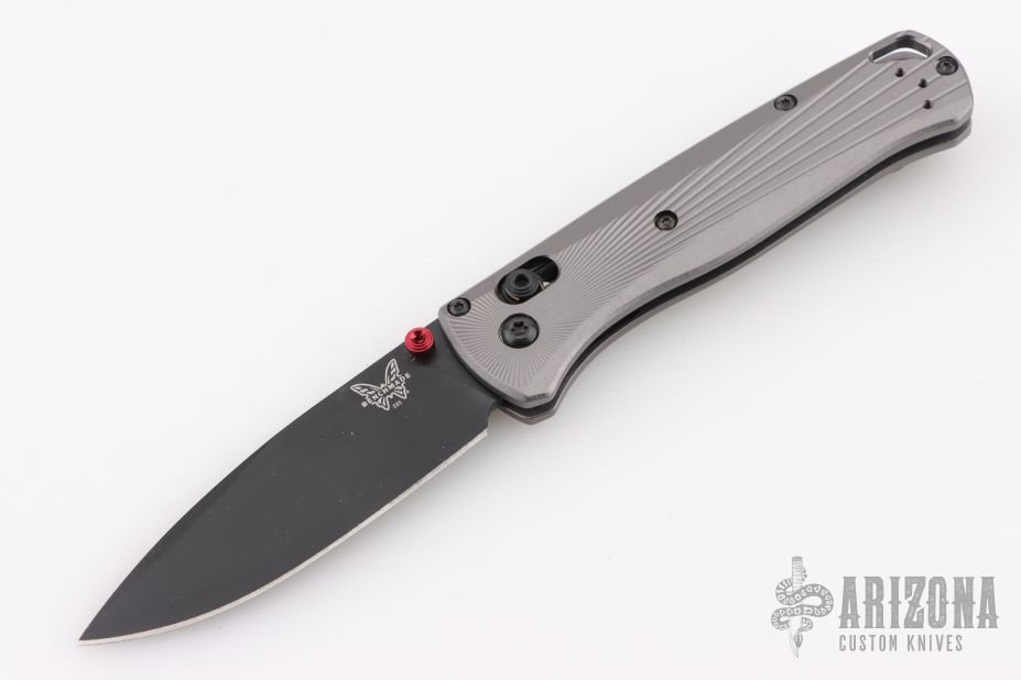 The Bugout features a drop point blade with a flat dark Cerakote finish. It's a manual opener with ambidextrous thumb studs. This AXIS lock has a milled aluminum frame and black hardware, a black mini deep-carry pocket clip, and a lanyard hole. Includes original box and papers. The box is deluxe. Has marks on the clip, otherwise Excellent condition.