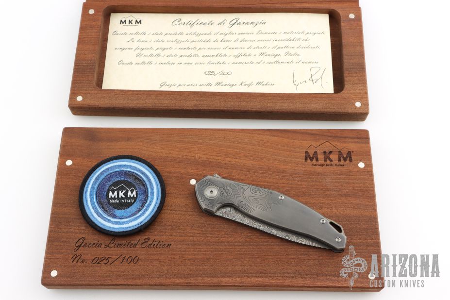 The Anso Goccia from MKM is a sophisticated flipper knife made with beautiful craftsmanship and materials! "Goccia" in Italian means "a drop" like a drop of water. The handle of the Goccia folding knife has a ripple pattern as if a bead of water struck it. This creates an elegant aesthetic and gripping traction. The overall length of the knife fits comfortably in hand and make use effortless.