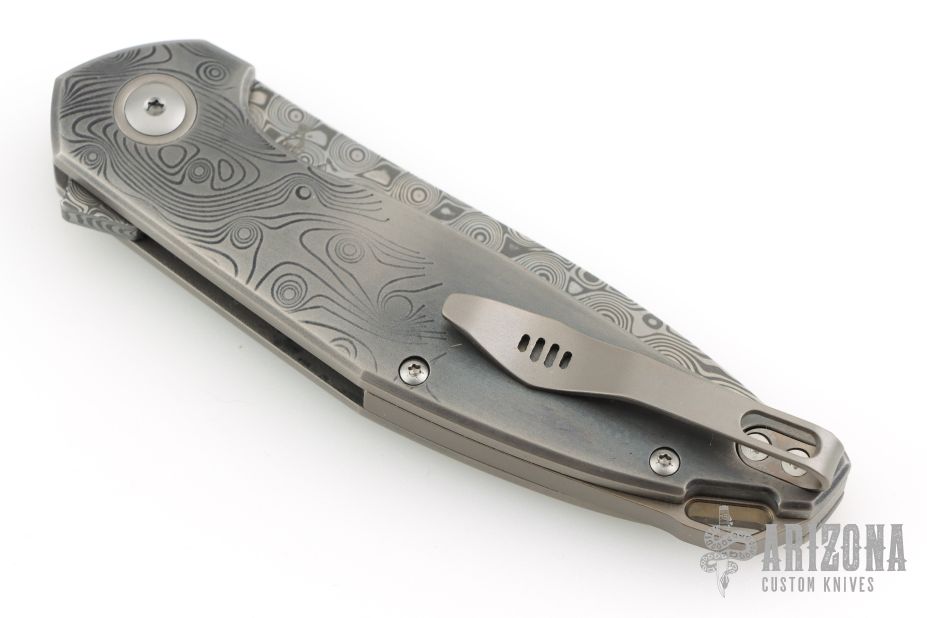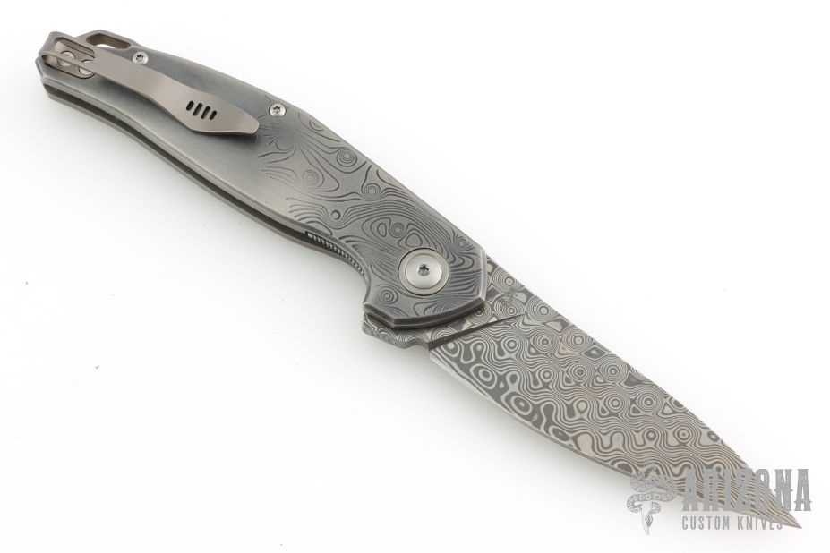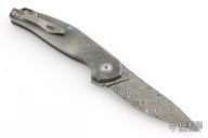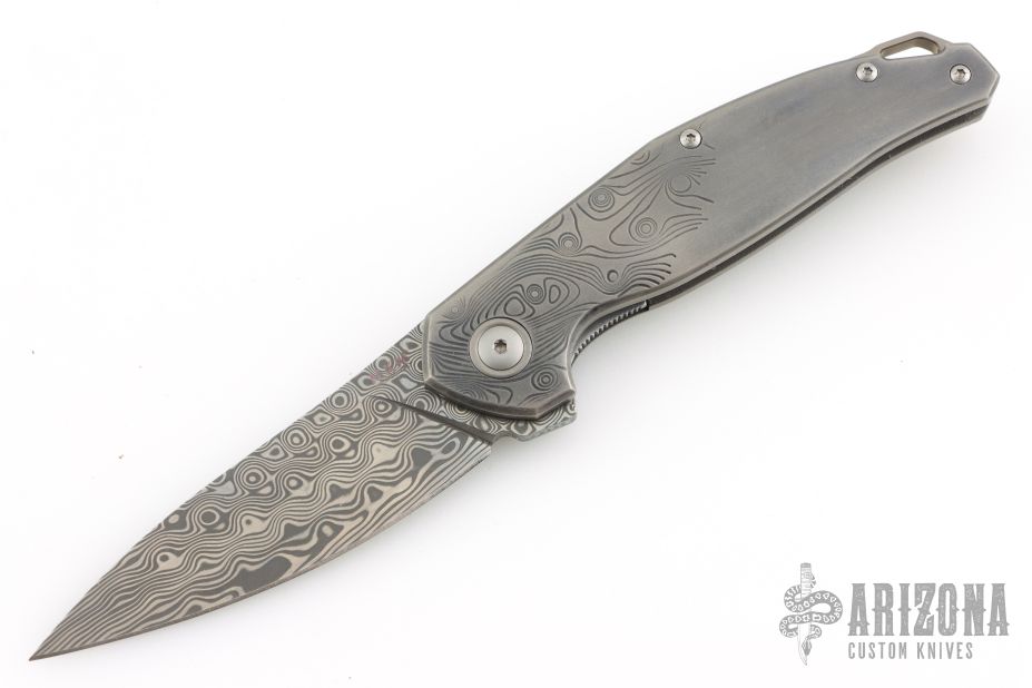 - Damascus blade with a drop point shape with an unique design.