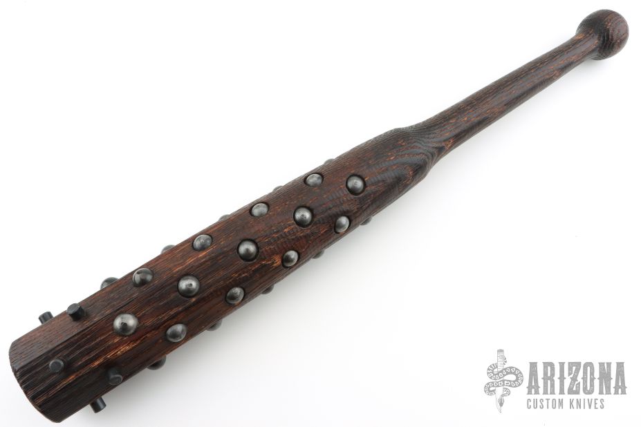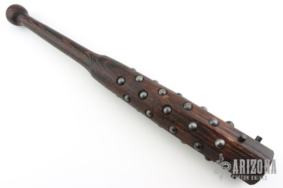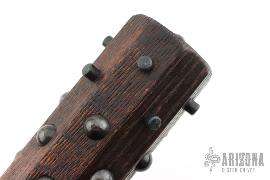 Tetsubo War Club by Ryan Johnson. Gold Point Forge, full hickory construction, hand inlaid rivets. Heavy and 3.125" in diameter. Has a few marks, excellent condition.