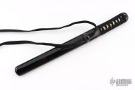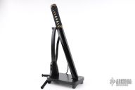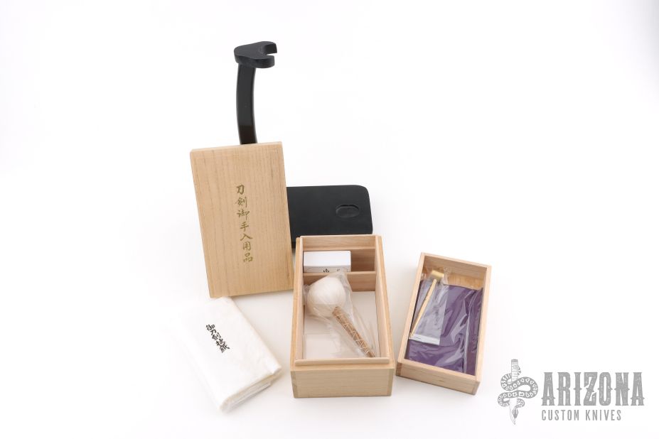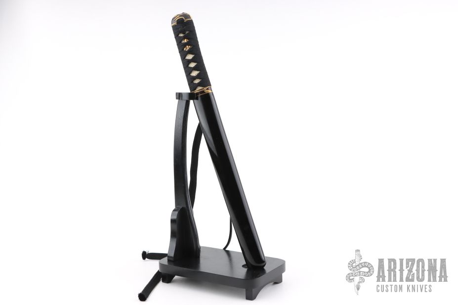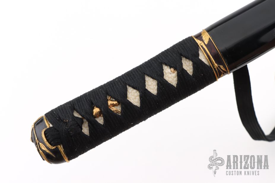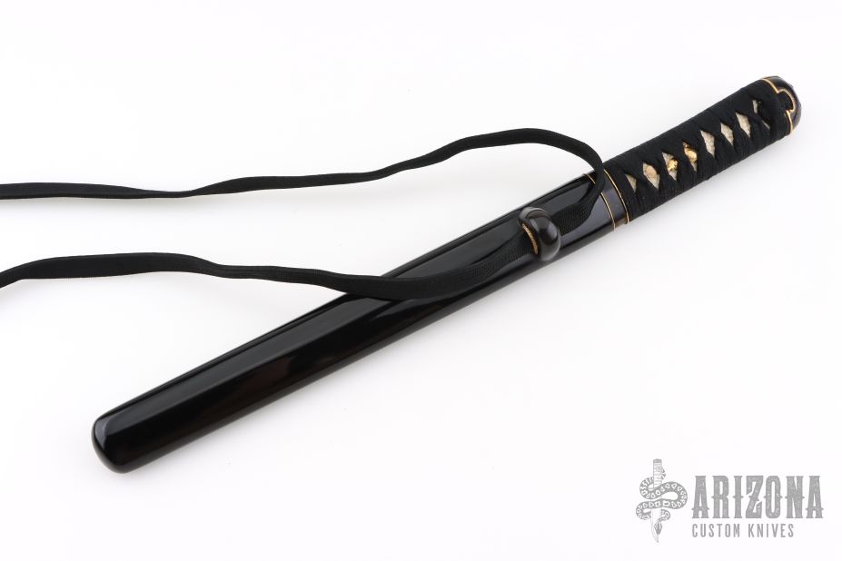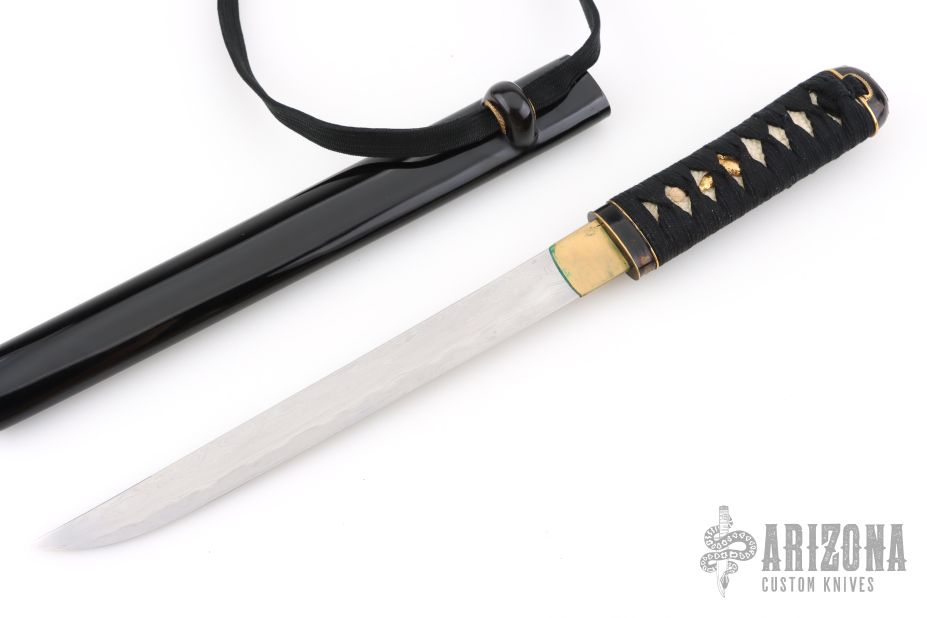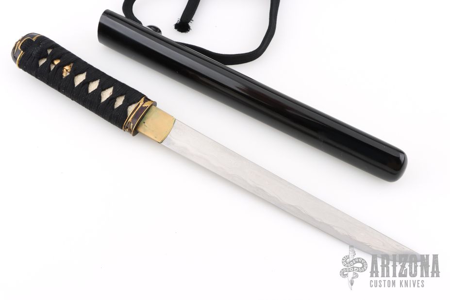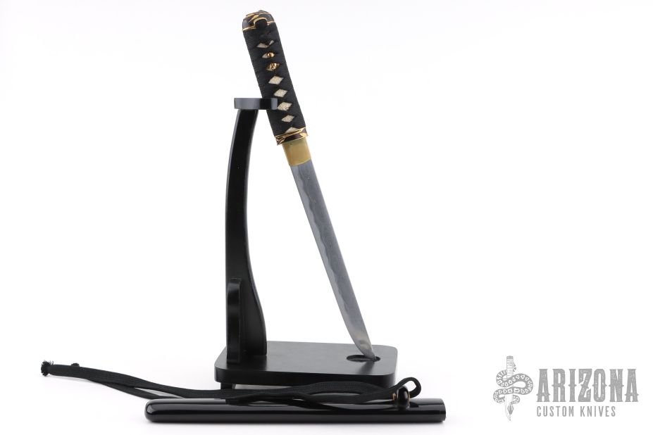 Handmade by Paul Chen. This Tanto has a 9" blade with a beautiful hamon Damascus blade, 1/4" blade stock and 1" blade depth, hidden tang construction. The handle has a brass collar, blackened brass guard, and a black leather wrapped handle over white rayskin. The handle is adorned with two menukis. Comes with a black scabbard and a black cloth bag. Comes with cleaning kit in a wooden box with small hammer, oil, and clothes. Comes with a wood display stand. Has a light patina, and some light scratches, otherwise Excellent condition.