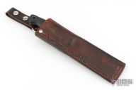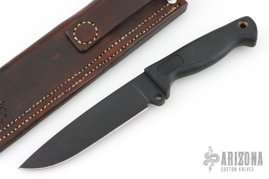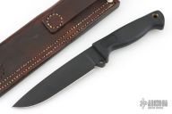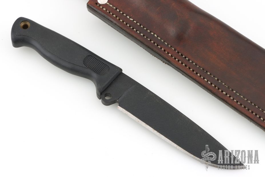 This Busse Basic 5 has a black coated drop point blade with hidden tang. Blade width is .258", width is 1.264". Handle is black non-slip rubber with lanyard hole. Comes with JRE Dangler leather sheath. Has a couple light marks, Excellent condition. Rare Euro version.