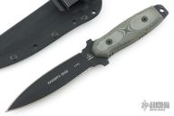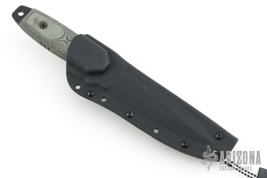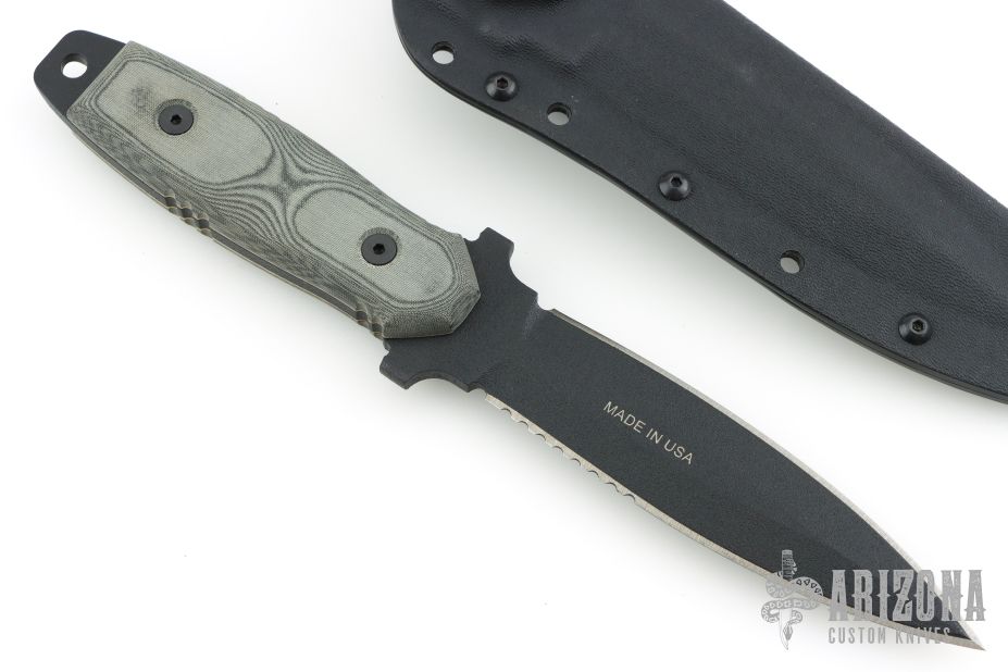 This knife has a black double edged blade with one partially serrated edge, .2" blade stock and 1.141" blade depth, full tang construction with black linen micarta scales and white liners. Comes with a kydex sheath. Excellent condition.