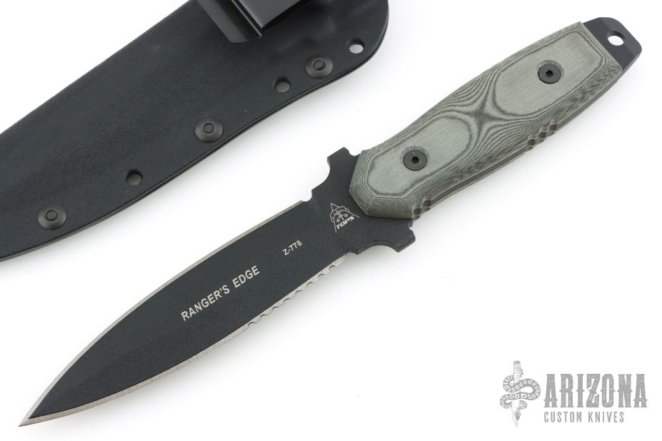 "MSG Kim Breed 5th Special Forces RET., is a notable knife maker as well as an authority on Blades. In an article appearing in Blade Magazine March 2002, about "Knives At War - Blades In Afghanistan" he wrote: "Pieces such as the Ranger's Edge from TOPS Knives are among those being taken to Afghanistan by the author's buddies from the 5th Special Forces." This is a double edged fine crafted tool with an outstanding pry tip extending from the handle, helping you to avoid prying with the point of the knife. A definite "will carry" in harms way."