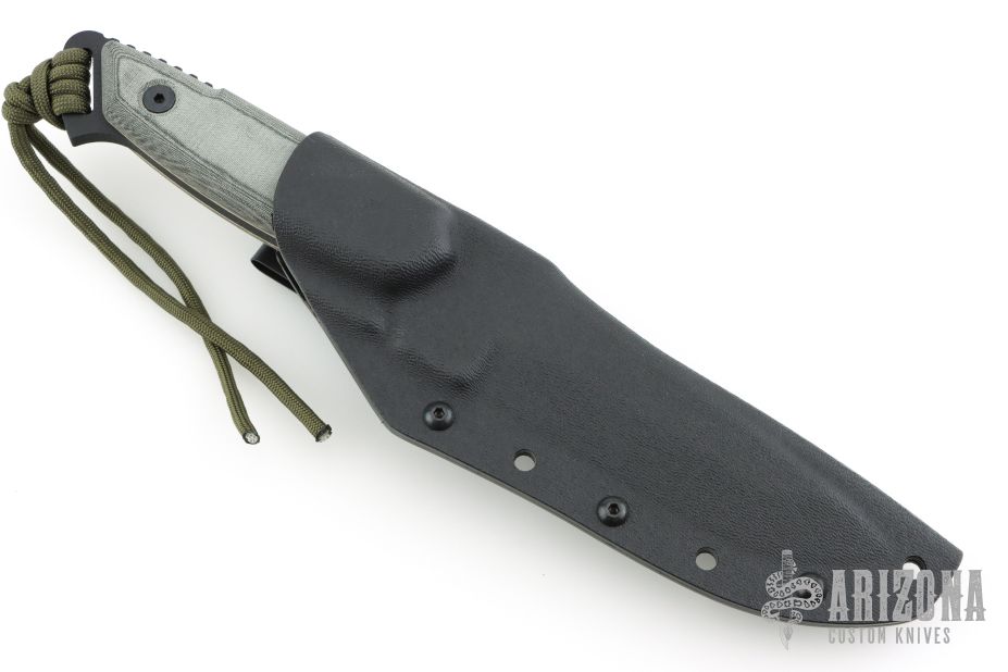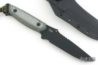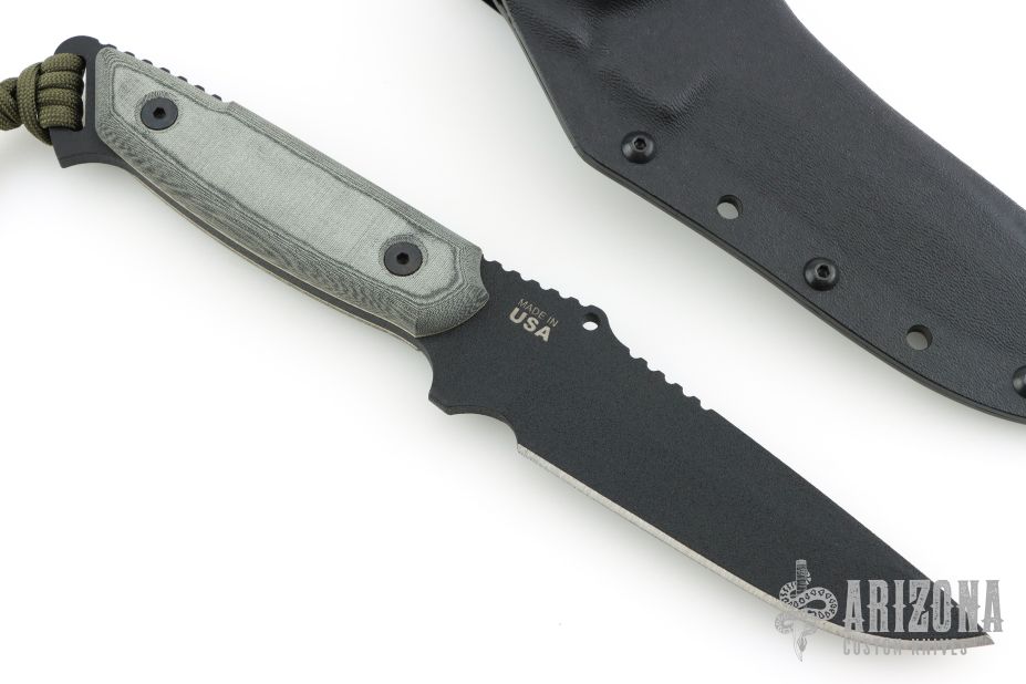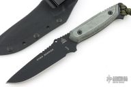 If you need a knife you can count on in combat and in survival situations, the Dawn Warrior better be on your list. The 3/16" thick full tang blade can take the abuse you've come to expect from all TOPS Knives and the black linen micarta handle scales are durable and strong. This knife was designed by D.J. Clifford and features a handle that has two sections of thumb jimping and a forward positioned index choil for choking up on the blade for those delicate tasks. Includes Kydex sheath with rotating steel spring clip. Comes with original Kydex sheath. Excellent condition.