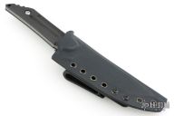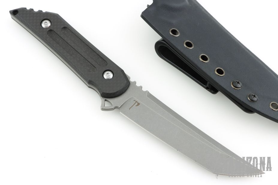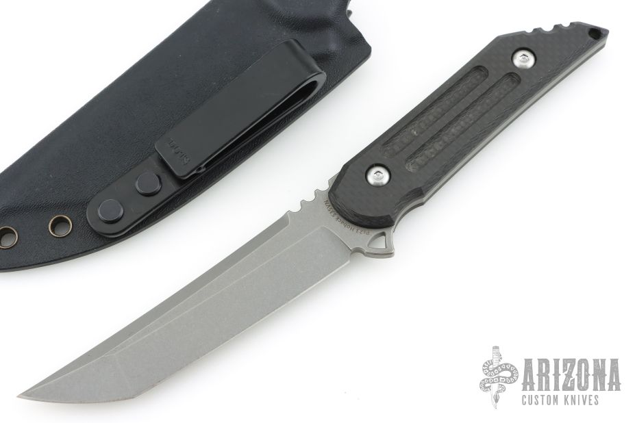 This Fixed Blade Kwaiback by Jake Hoback features a stonewashed tanto blade with notched thumbrest, .155" blade stock and 1.093" blade depth, full tang construction with carbon fiber scales. Comes with a kydex sheath. Excellent condition.