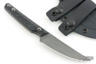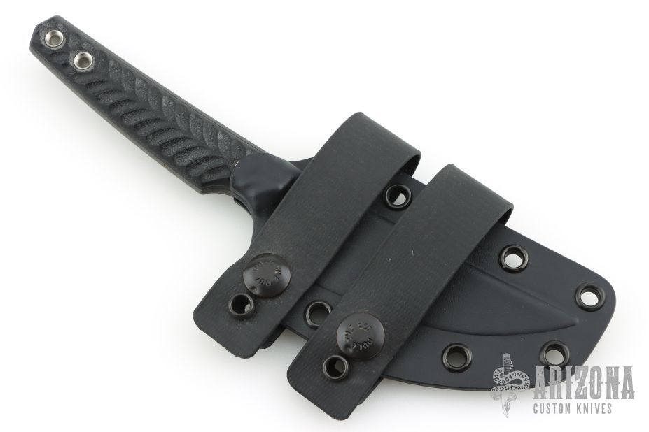 The Unmei is a Japanese Kwaiken style fixed blade knife that excels in both concealed and everyday carry roles. The RMJ rendition of the Kwaiken style functions well in both urban and rural settings and is a great companion for any adventure. Made from .130'' thick Nitro-V steel, the Unmei weighs in at 3.5 ounces. The light and thin design makes this a great knife for any slicing needs. The blade has a Tungsten Cerakote finish for corrosion and glare resistance, and added durability. The beveled and contoured G10 grips feature diagonal texturing for an aggressive but comfortable and secure grip. The Unmei comes with a molded kydex scabbard including two MAD straps that allow for scout carry (horizontal) and inside the waistband (IWB) vertical carry. The Unmei is MOLLE compatible and can also be attached to any pack, plate carrier or similar gear with PALS webbing. The scabbard will work with most of the popular clips and mounts like the Discreet Carry Concepts Clip and UltiClip. Comes with original sheath. Excellent condition.