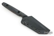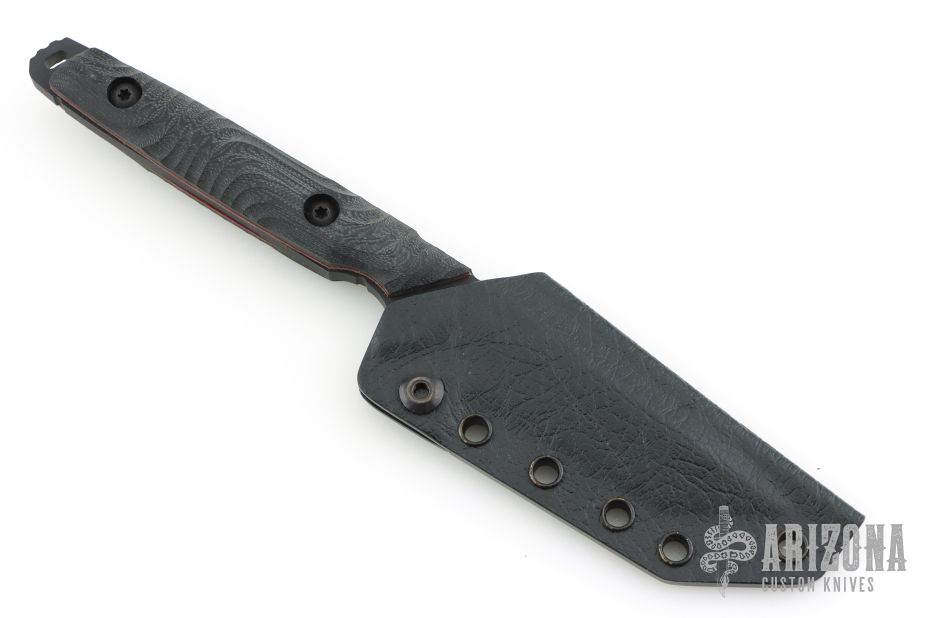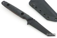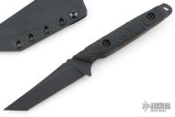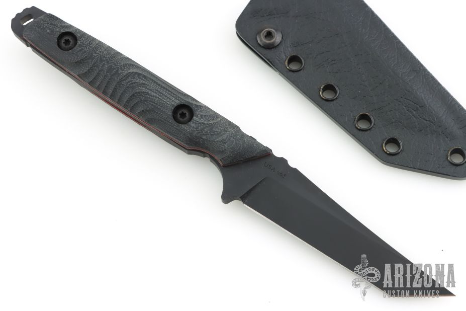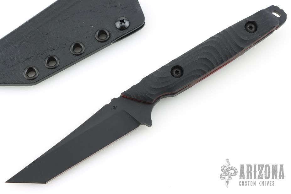 This Kingpin by Toor Knives features a black tanto blade with notched thumbrest, .188" blade stock and .948" blade depth, full tang construction. The handle has black G-10 scales with red G-10 liners. Comes with a kydex sheath. Excellent condition.